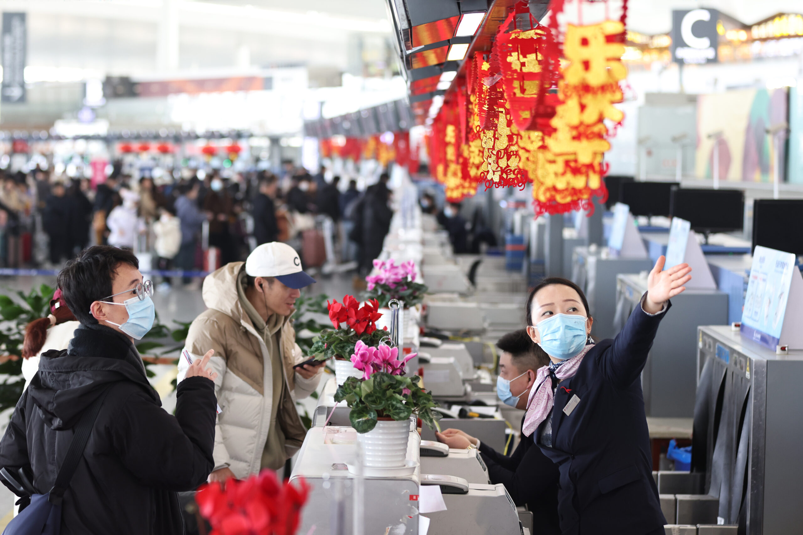 2月8日,旅客在南京禄口国际机场中国东方航空值机柜台办理登机手续。春节临近,民航迎来客流高峰。 未经...