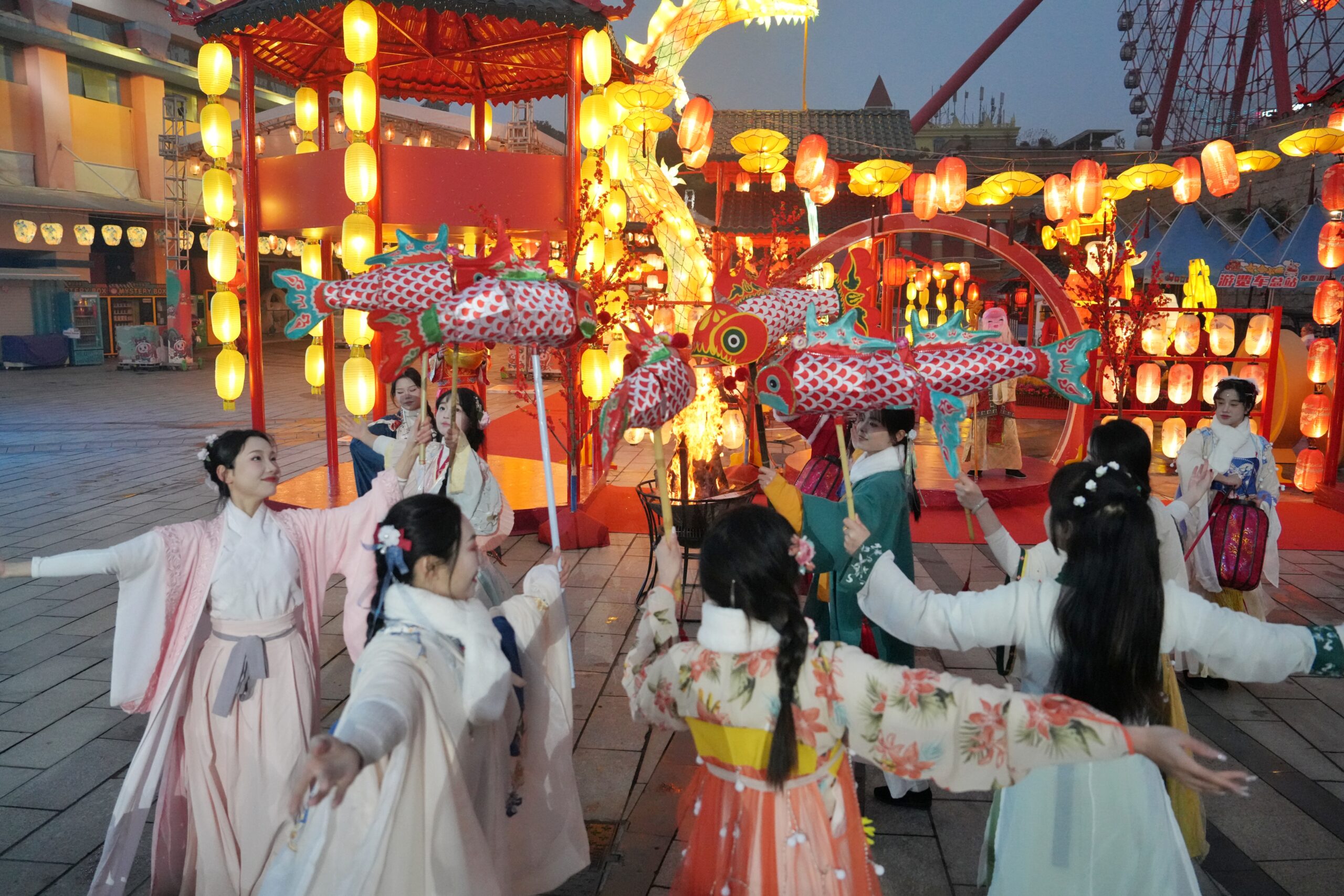 2月8日,表演者跳起了鱼龙灯舞。当日,“新春九龙大庙会”在长沙世界之窗开启,表演者用9条巨龙与鱼龙灯...