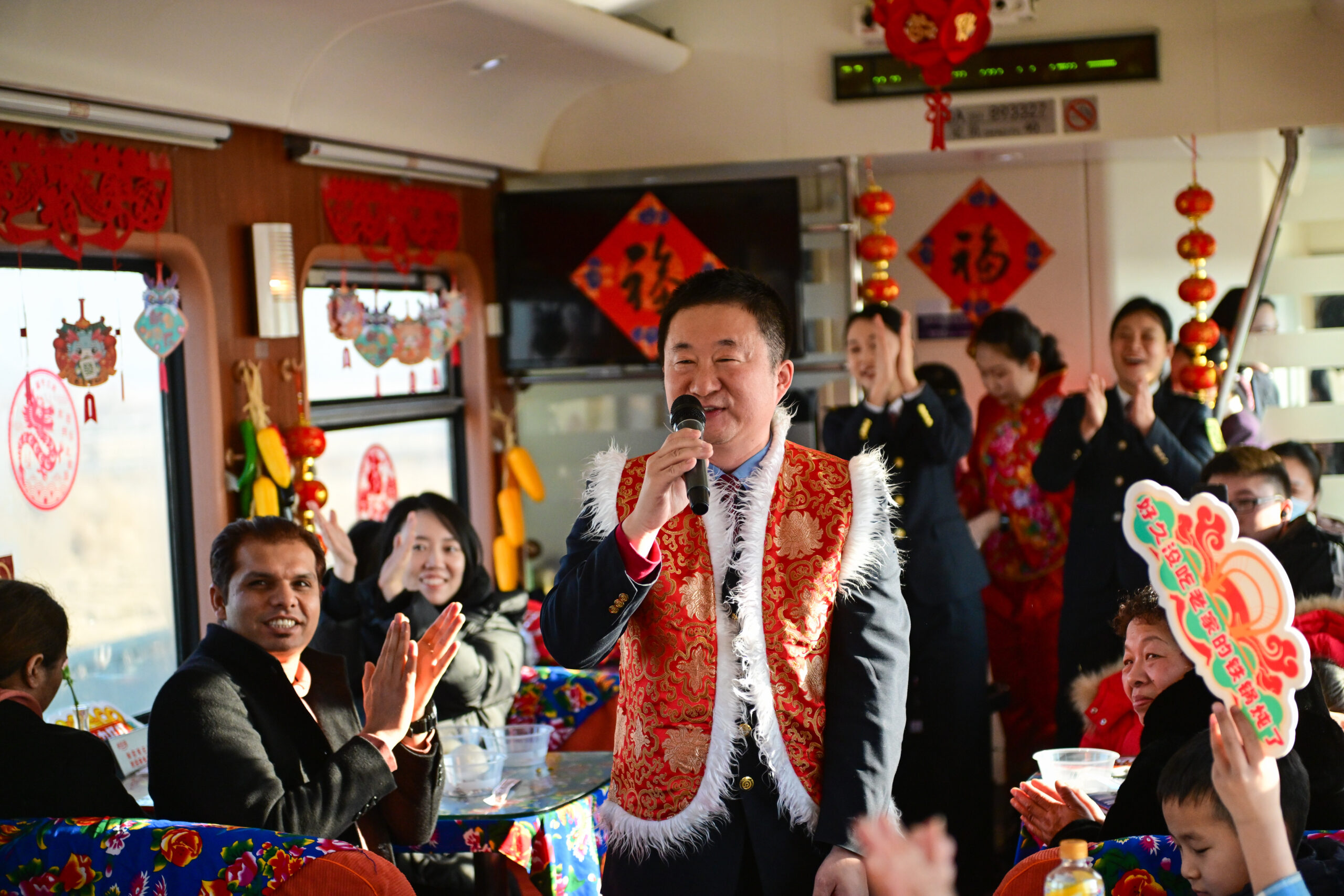2月7日,在沈阳北开往广州的Z12次列车上,车厢里布满了窗花、拉花、大花布,年味十足。中国铁路沈阳局...