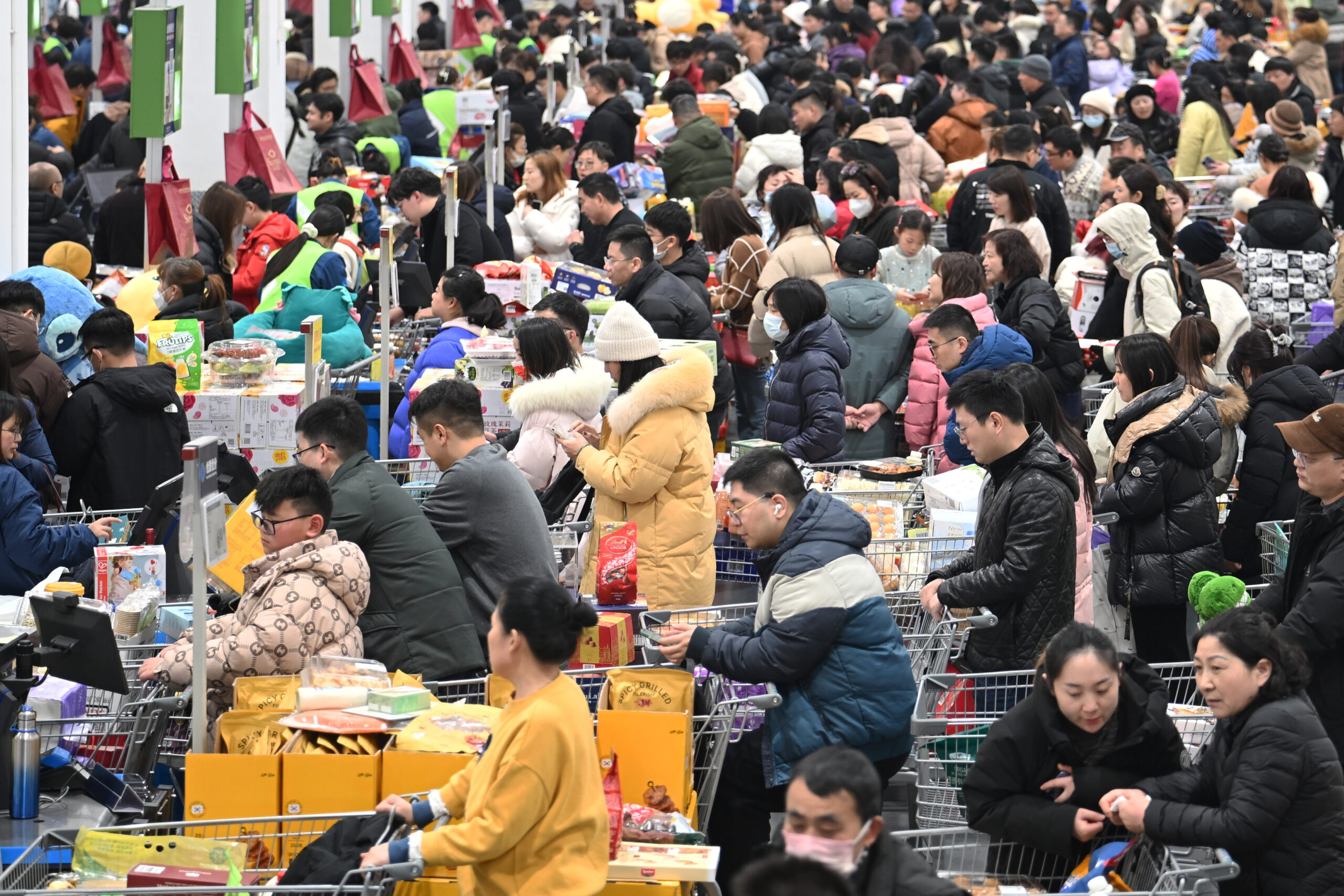 2月7日,江苏南京,在山姆会员商店内购买商品的市民在收银处排队。春节将至,当地消费市场人气旺。 未经...