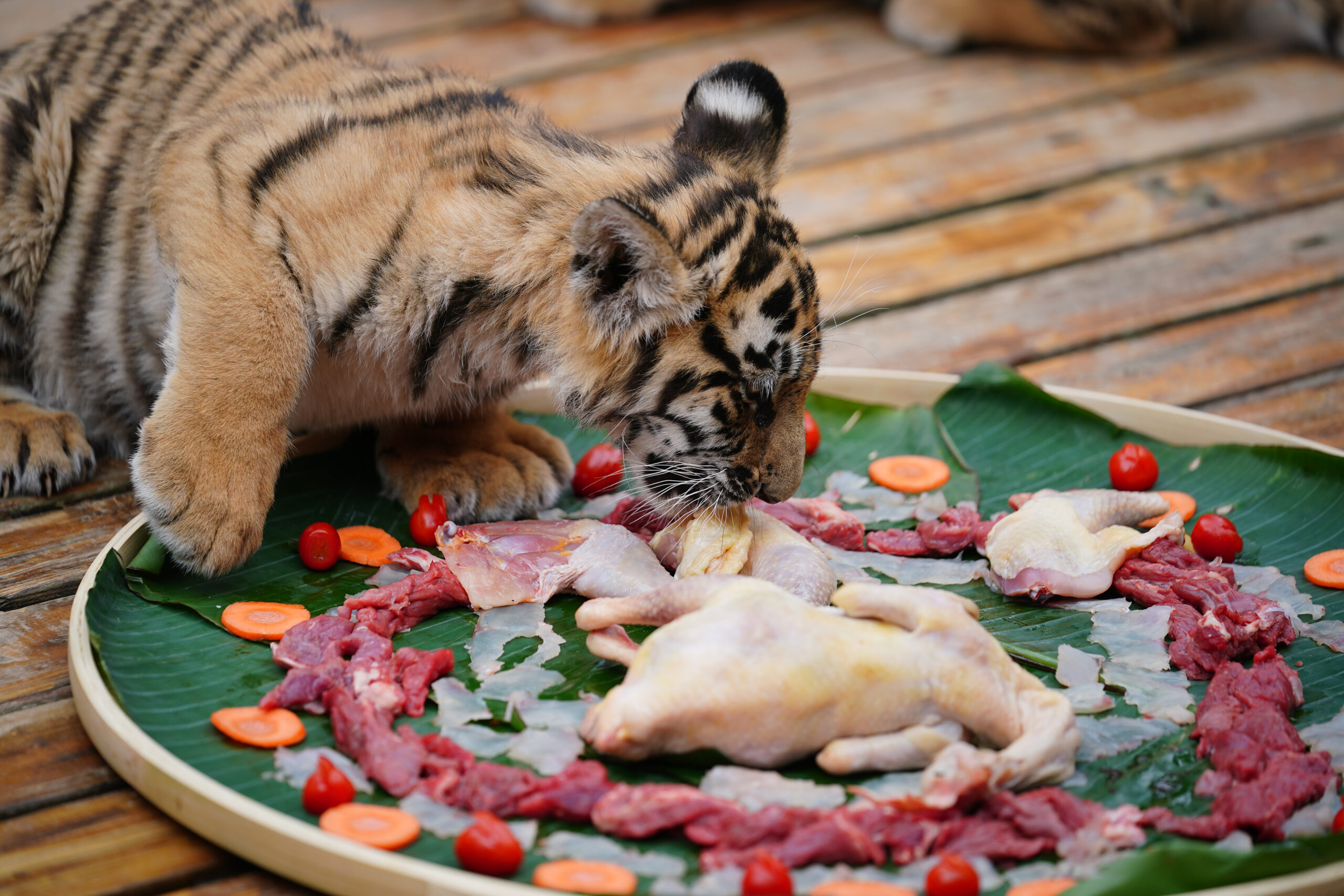 2月7日,小老虎享用美食。当日,随着春节临近,位于昆明市的云南野生动物园根据园区动物食性,定制了特殊...
