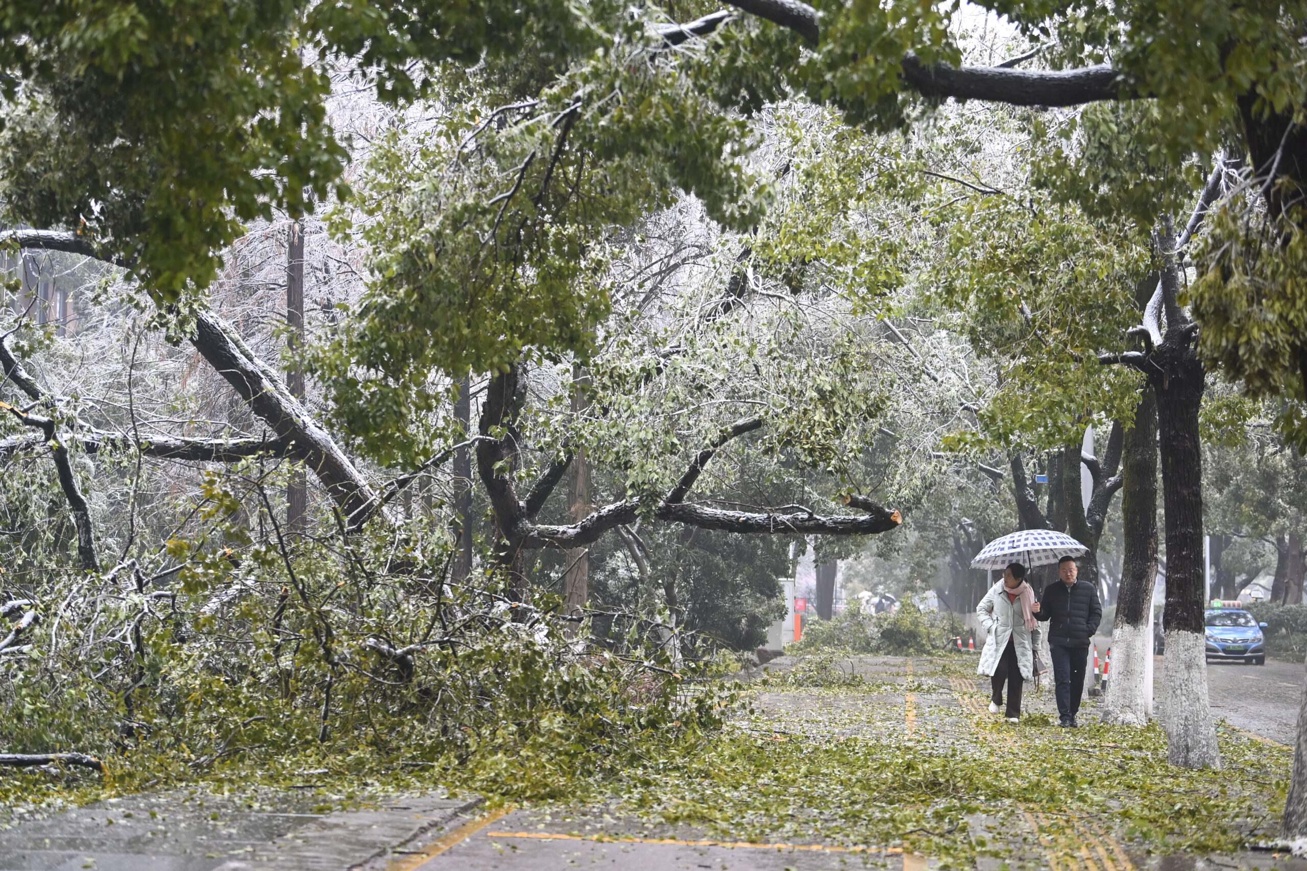 2月7日,长沙牌楼路上众多树木断裂。当日,受雨雪冰冻极端天气影响,长沙城区树木被厚厚的冰层覆盖,并出...