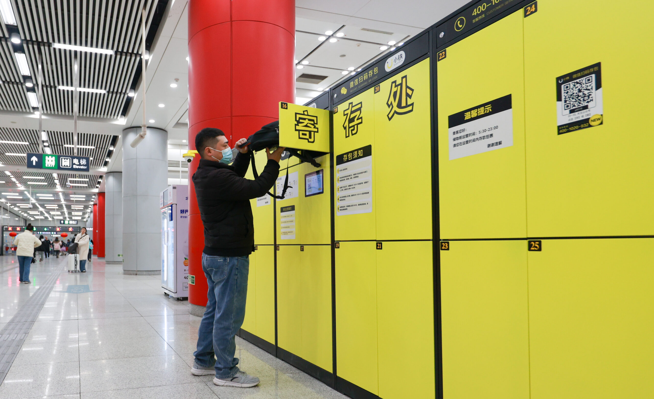 2月5日,乘客在北京地铁10号线丰台站内的共享寄存柜存放行李。为提高乘客出行便利性,北京地铁公司尝试...