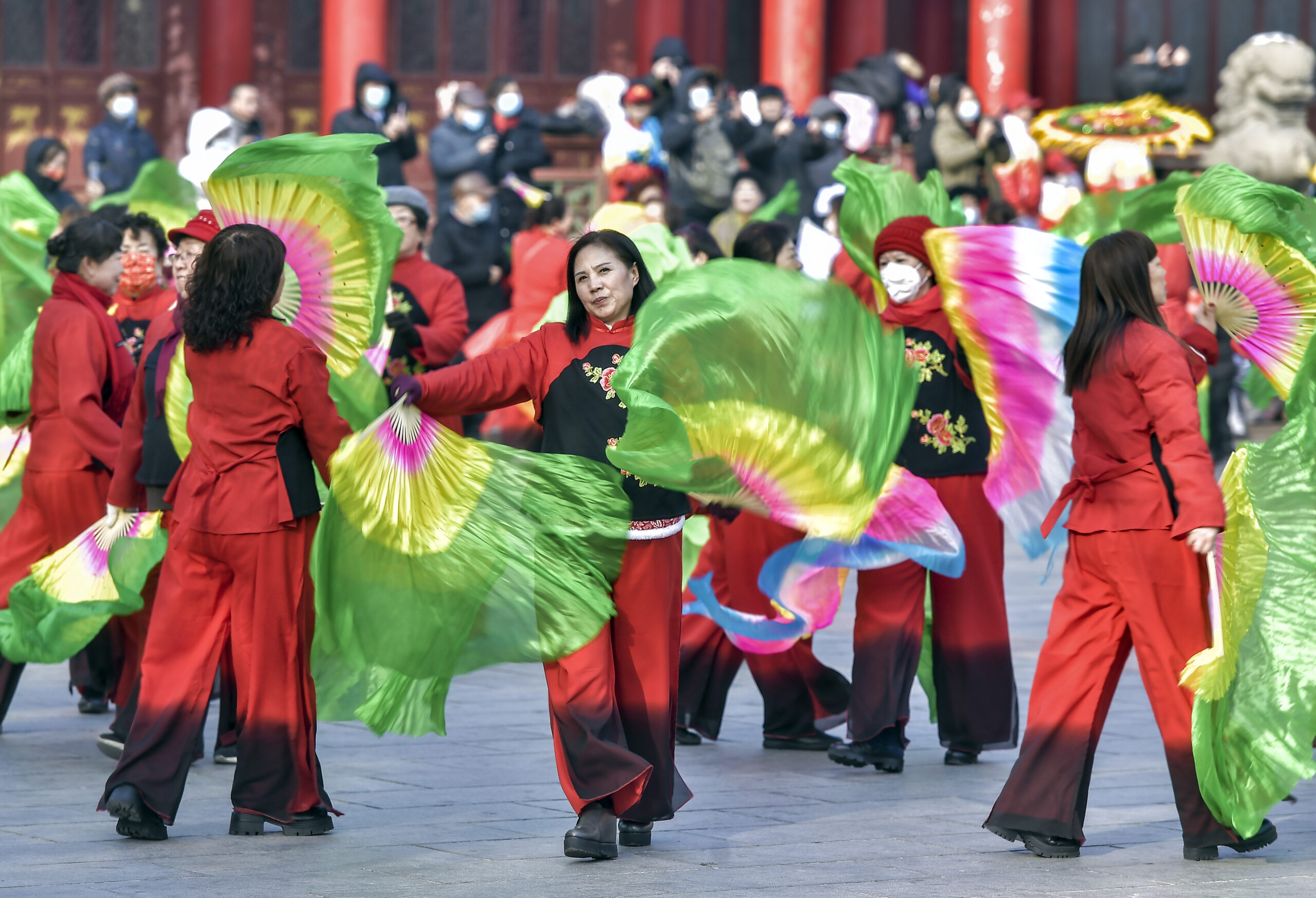 2月5日,新疆乌鲁木齐市人民公园,一支民间社火队伍随着鼓点声,扭起秧歌、挥舞彩扇,吸引众多市民观看,...