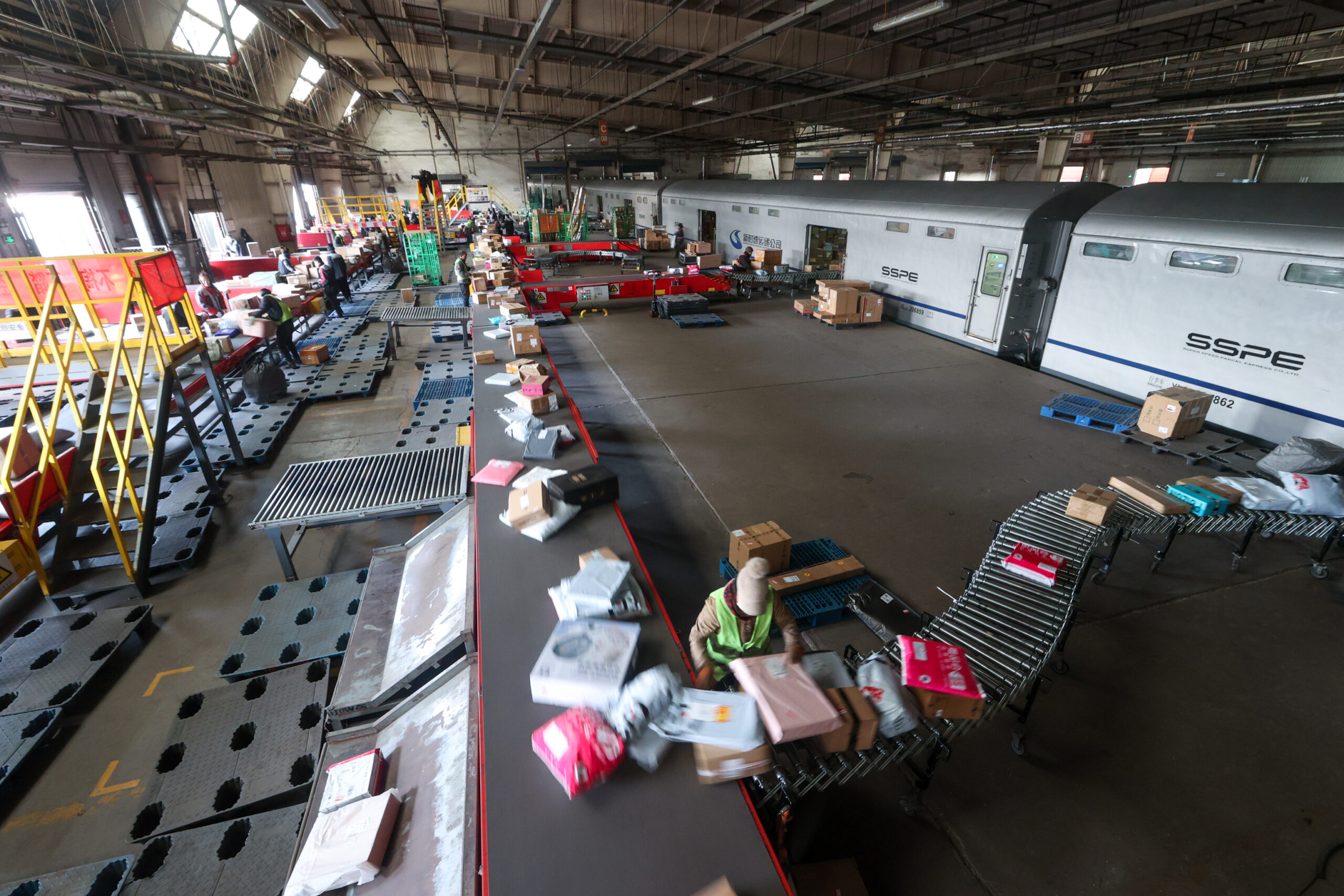 1月31日,在位于北京市大兴区的黄村铁路货场内,满载年货的X104次特快货物班列停靠站台,作业人员卸...