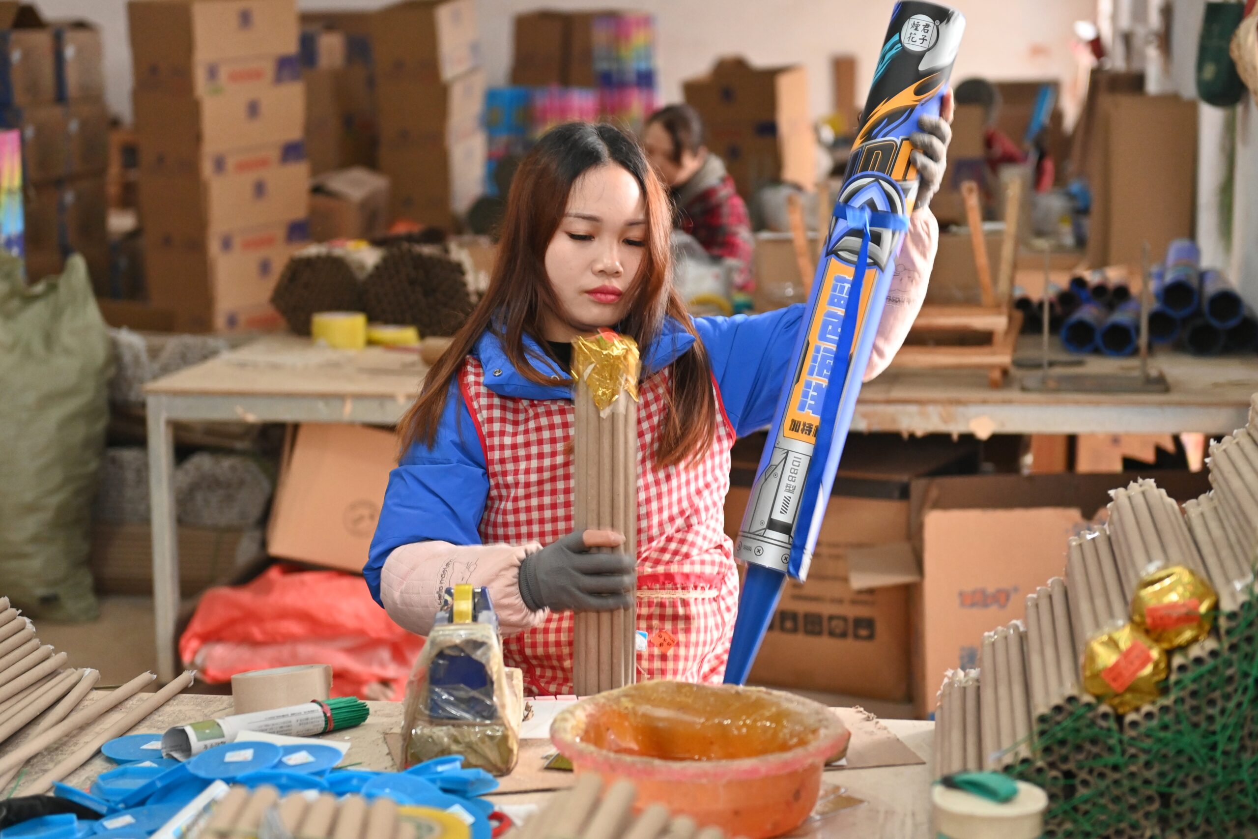 1月30日,工人在包装花炮。春节临近,“花炮之乡”湖南省浏阳市大瑶镇进入了一年中最为忙碌的时节,在保...