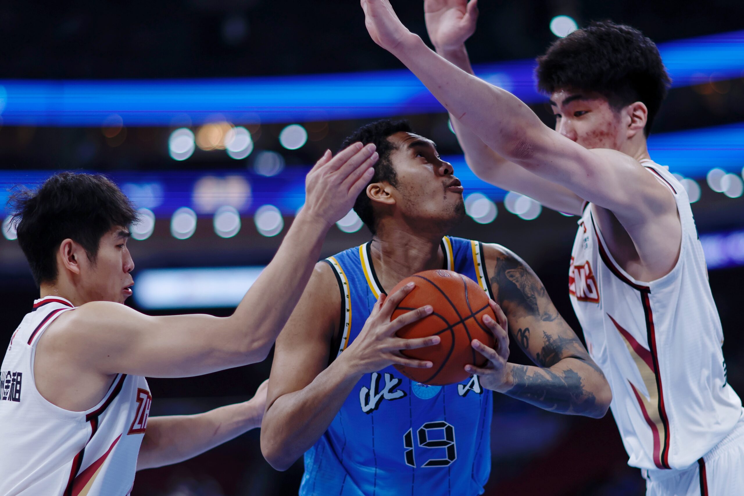 1月29日,北京北汽队塔瑞克(蓝衣)在比赛中进攻。当日,在北京进行的2023-2024赛季中国男子篮...