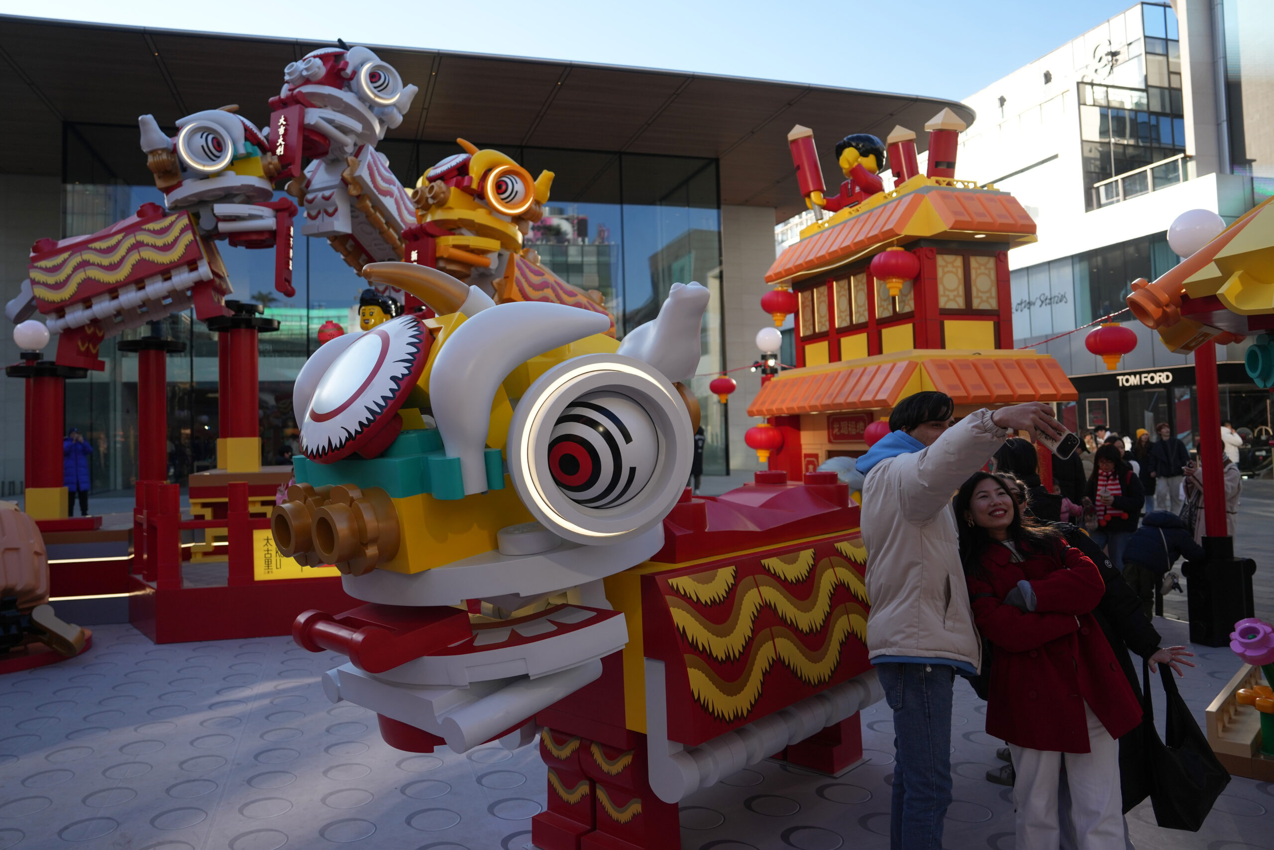 1月26日,北京三里屯太古里广场上设置的龙年主题乐高积木吸引民众。图为几名来自尼泊尔的留学生在舞狮积...