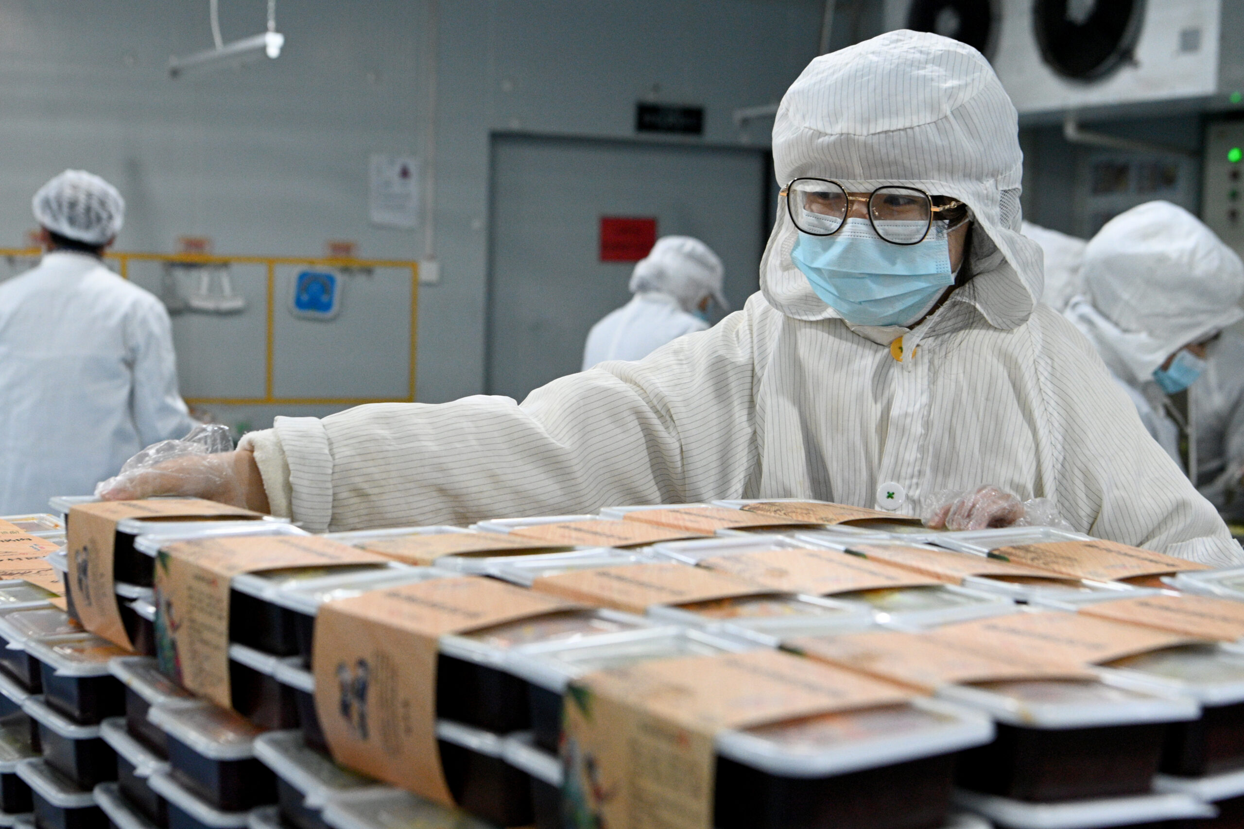 1月26日,在云南昆明一高铁冷链套餐生产基地内,工作人员整理分装完毕的套餐盒。当日是2024年中国春...