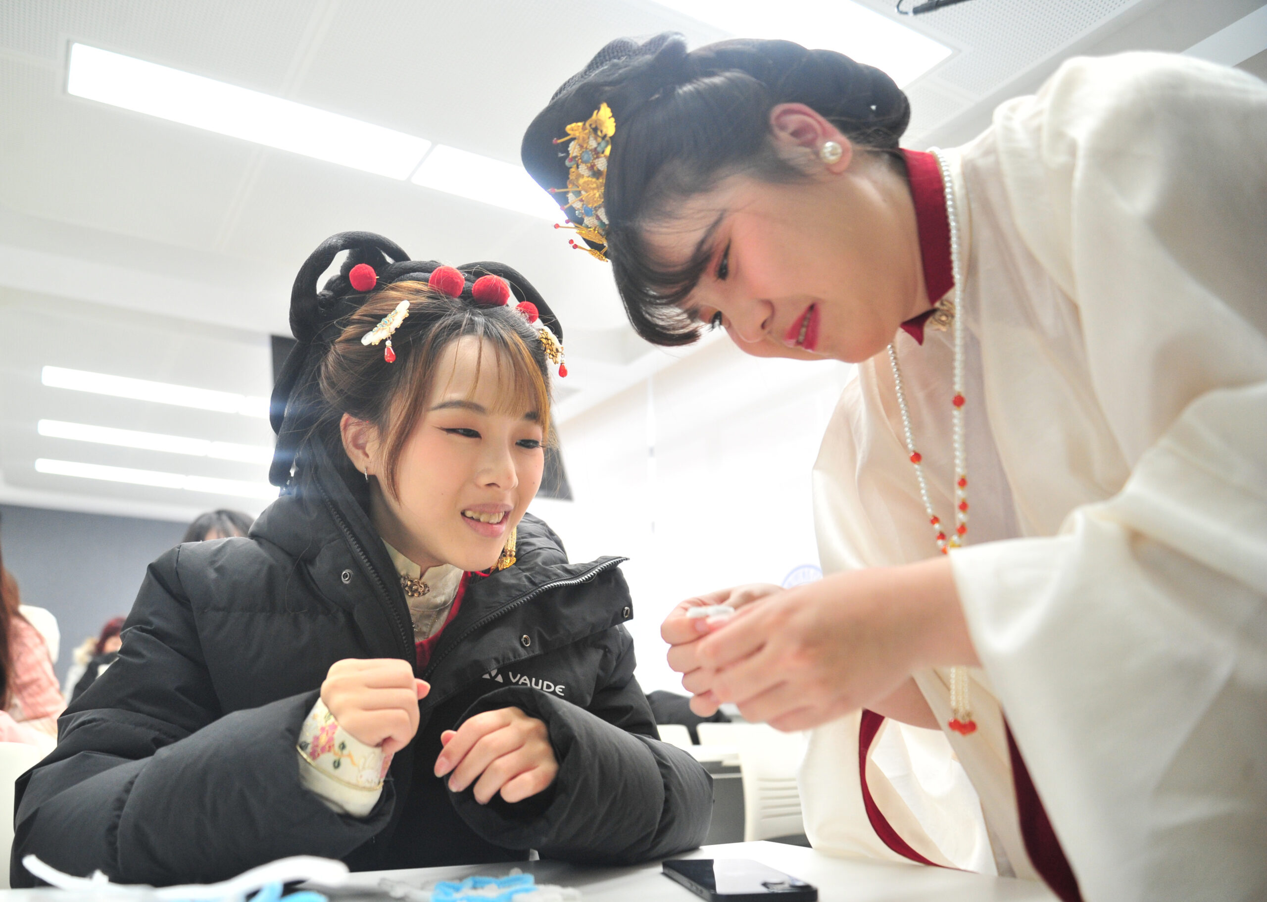 1月23日,吉林长春,台湾青年(左)在学习制作汉服手工仿绒花雪花胸针。当天,以“携手正青春 同心向未...