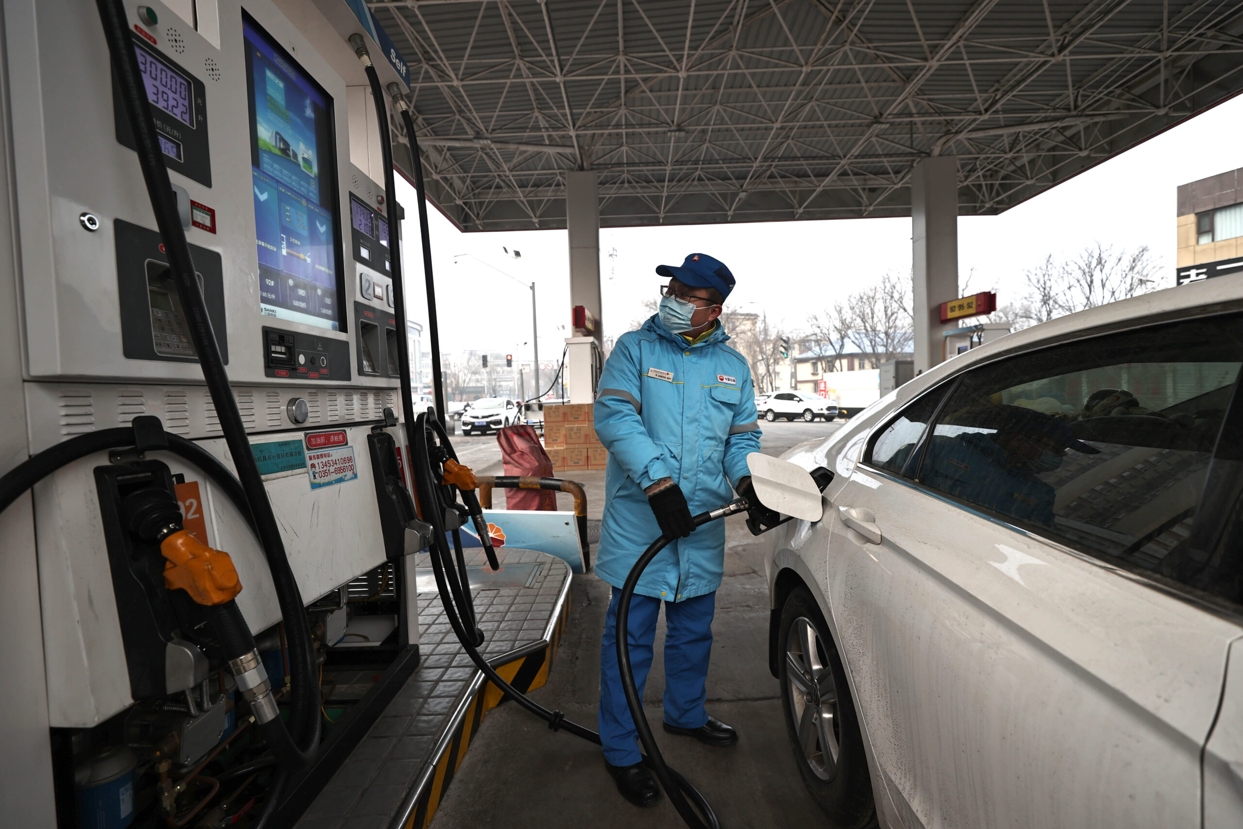 1月17日,山西太原,车辆在加油站加油。当日,中国国家发展和改革委员会发布消息称,根据近期国际市场油...