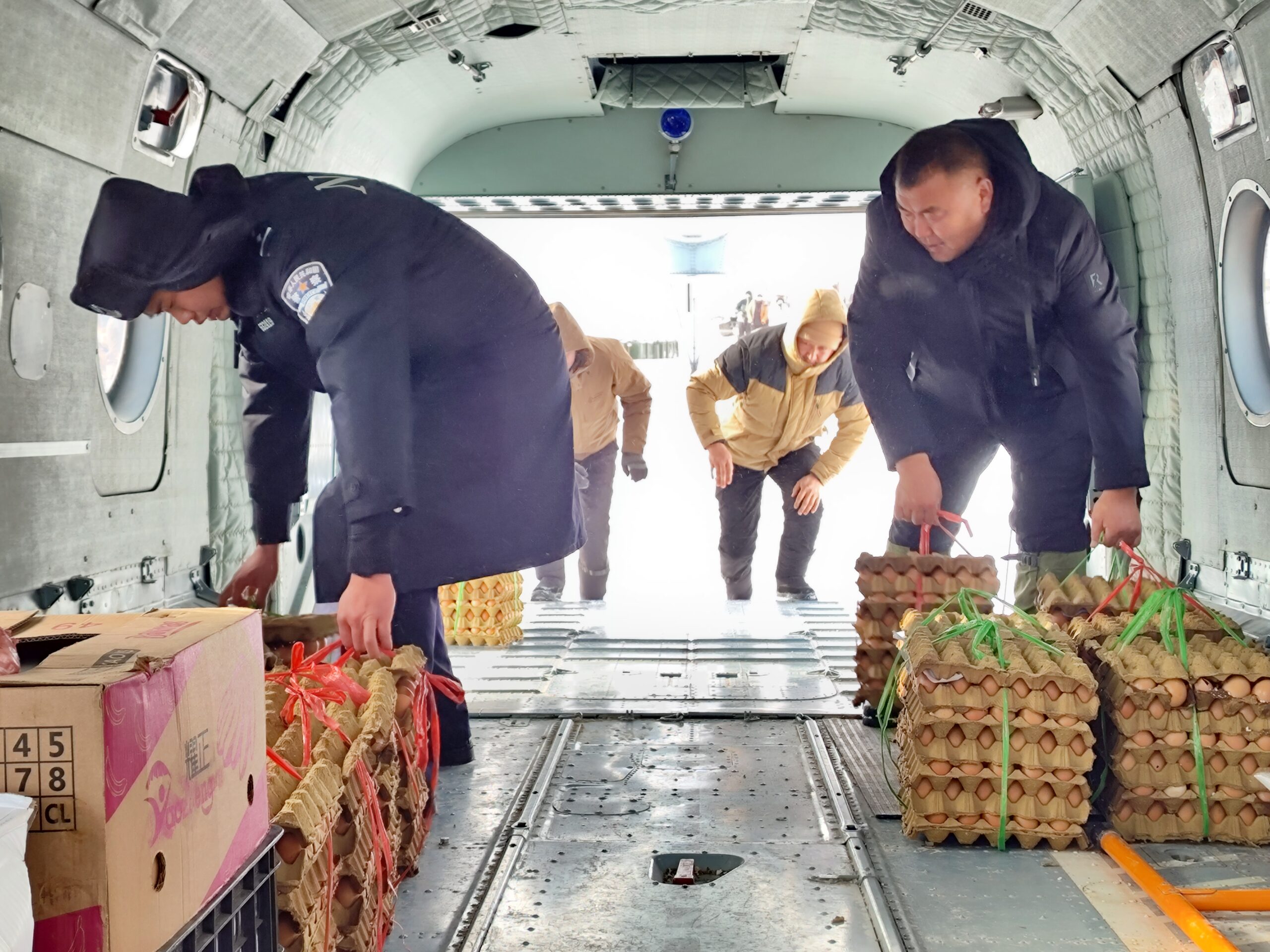 1月16日,新疆军区某陆航旅两架直升机装载药品、米、面、油、鸡蛋、水果、蔬菜等物资,飞赴新疆阿勒泰禾...