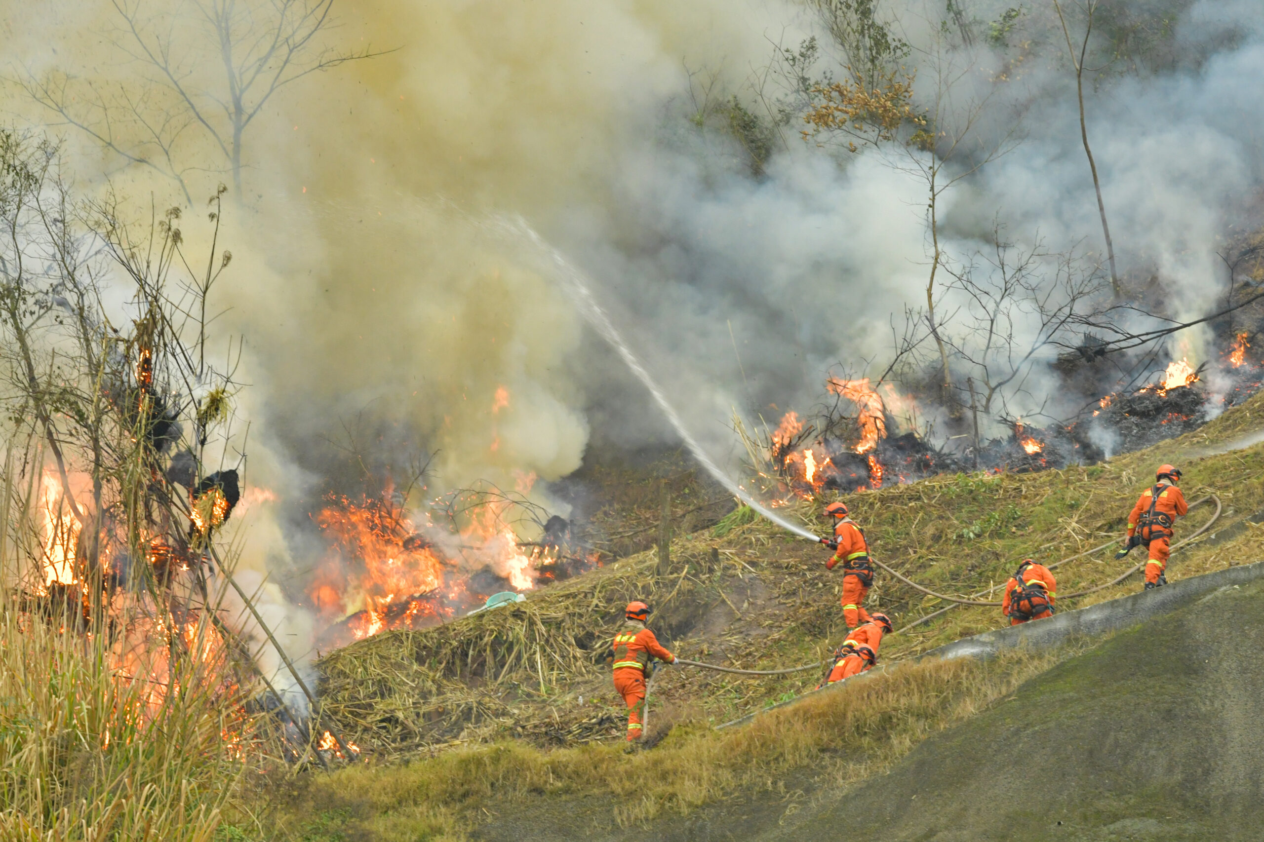 1月15日,四川达州,救援力量在进行灭火演练。当日,四川省、重庆市开展森林火灾联合应急演练。演练现场...