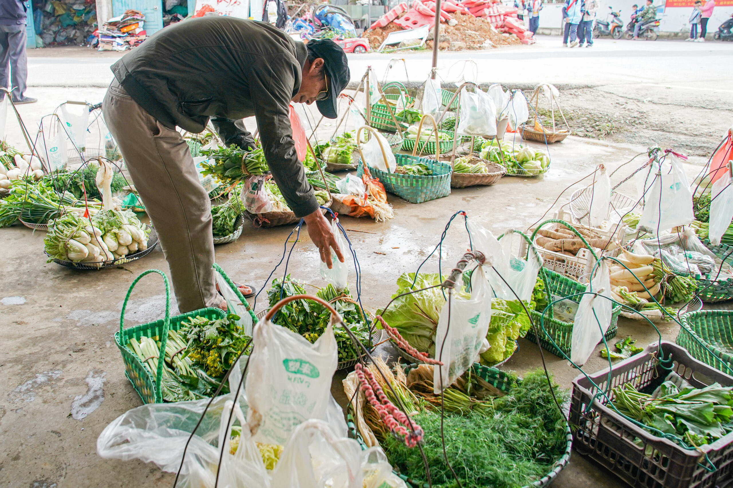 1月15日,广西南宁市西乡塘区乐洲村一处超市门口的“无人菜摊”,顾客选购新鲜蔬菜后向菜筐上的塑料袋投...