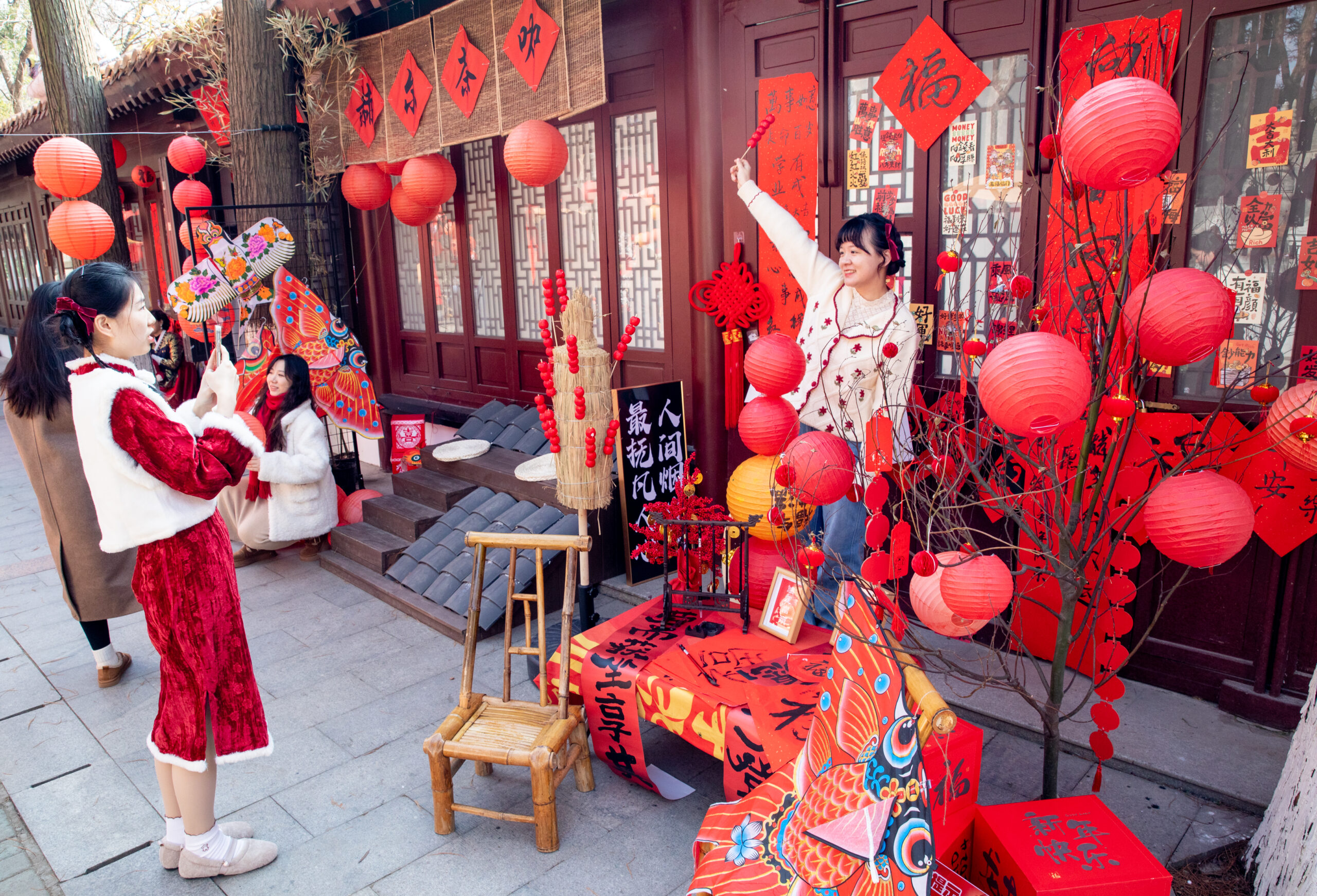 1月12日,市民在年味十足的新年装置景观前拍照。农历龙年将至,武汉解放公园里布置的新年装置景观,引来...