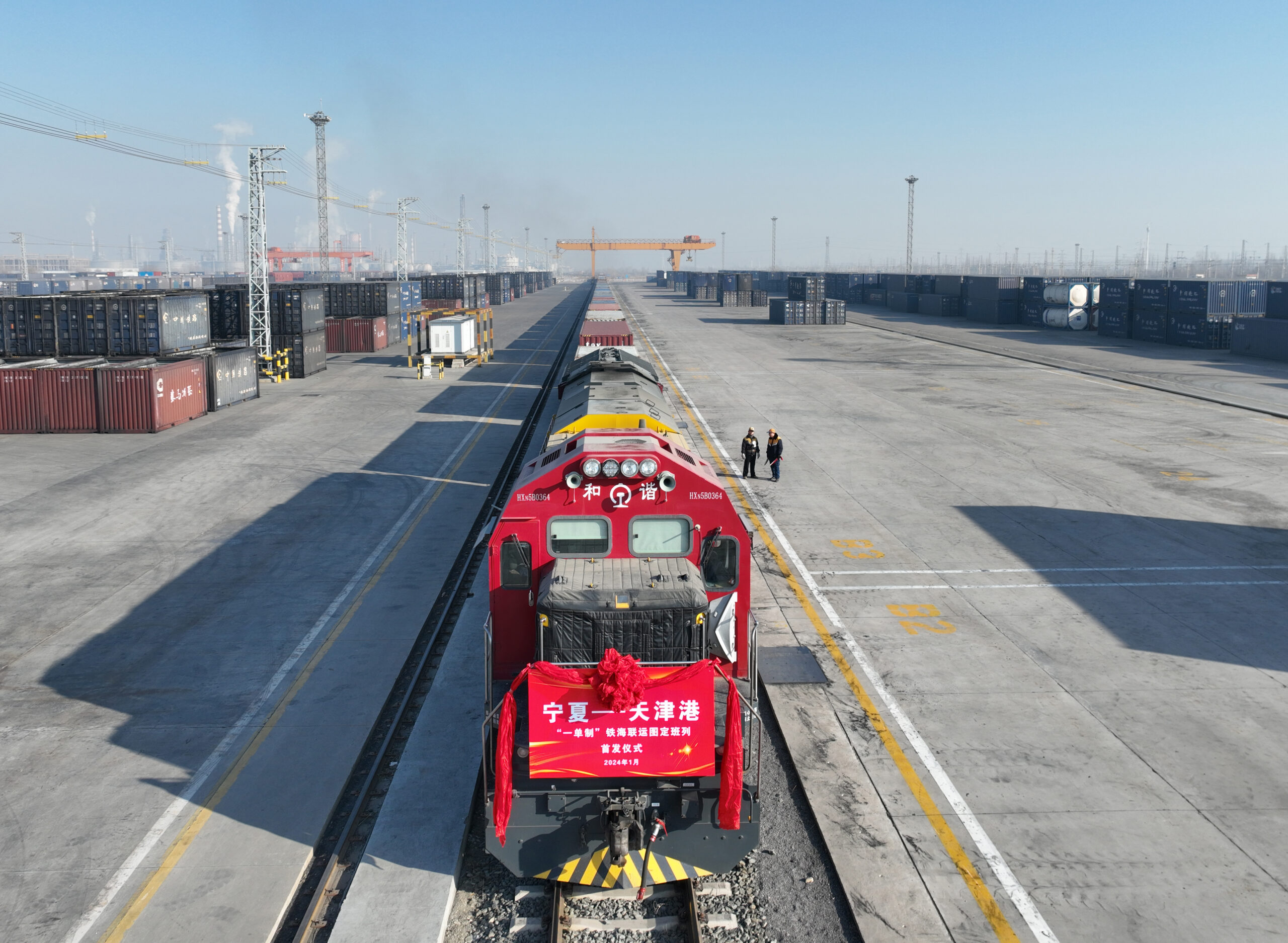 1月11日,一列满载着赖氨酸、双氰胺、腐殖酸钠等货物的铁海联运班列从中国铁路兰州局银川货运中心银川南...