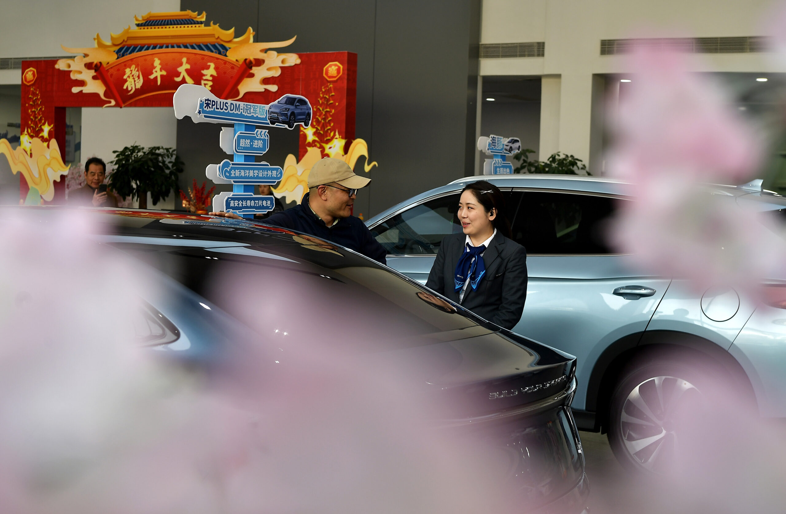 1月11日,市民在福州市一家汽车4S店向工作人员(右)了解销售的车辆。近日,福建发布2024年一季度...