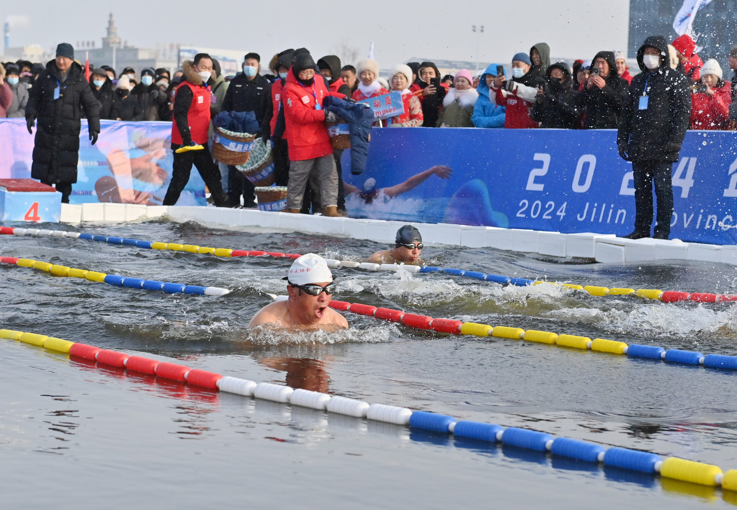 1月11日,吉林敦化,选手在湖水中激烈比拼。 当天,2024年吉林省大众冬泳挑战赛暨敦化第七届国际冬...