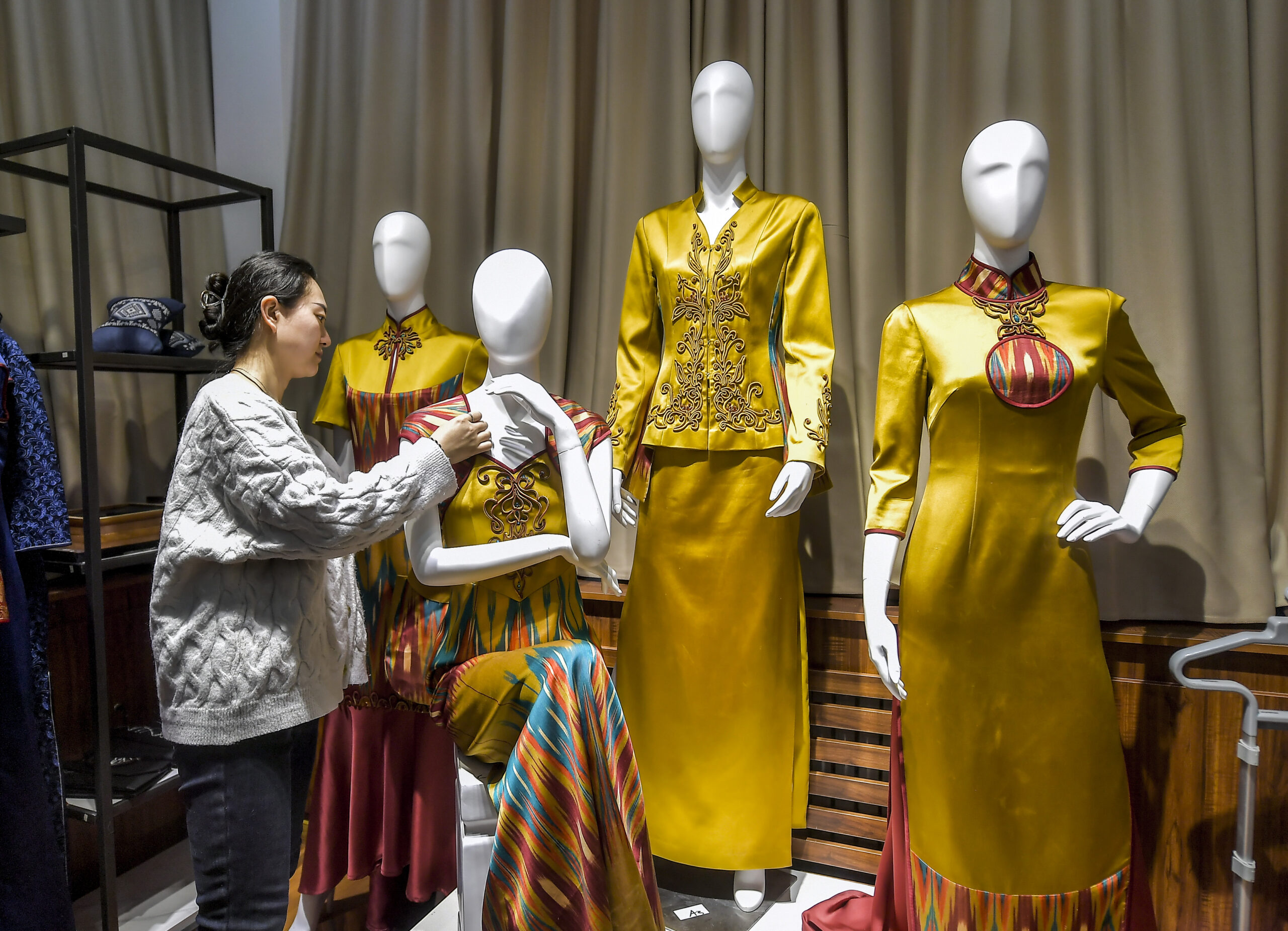 1月11日,新疆乌鲁木齐市二道桥大巴扎非遗文创馆,工作人员在整理融入艾德莱斯元素的服饰。该馆于近日重...