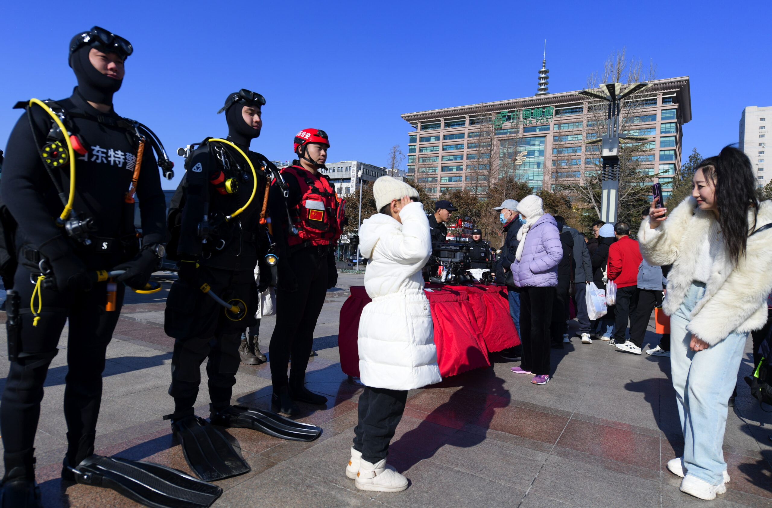 1月10日,市民与山东特警“蛙人”合影。当日是第四个“中国人民警察节”,也是全国第38个“110宣传...