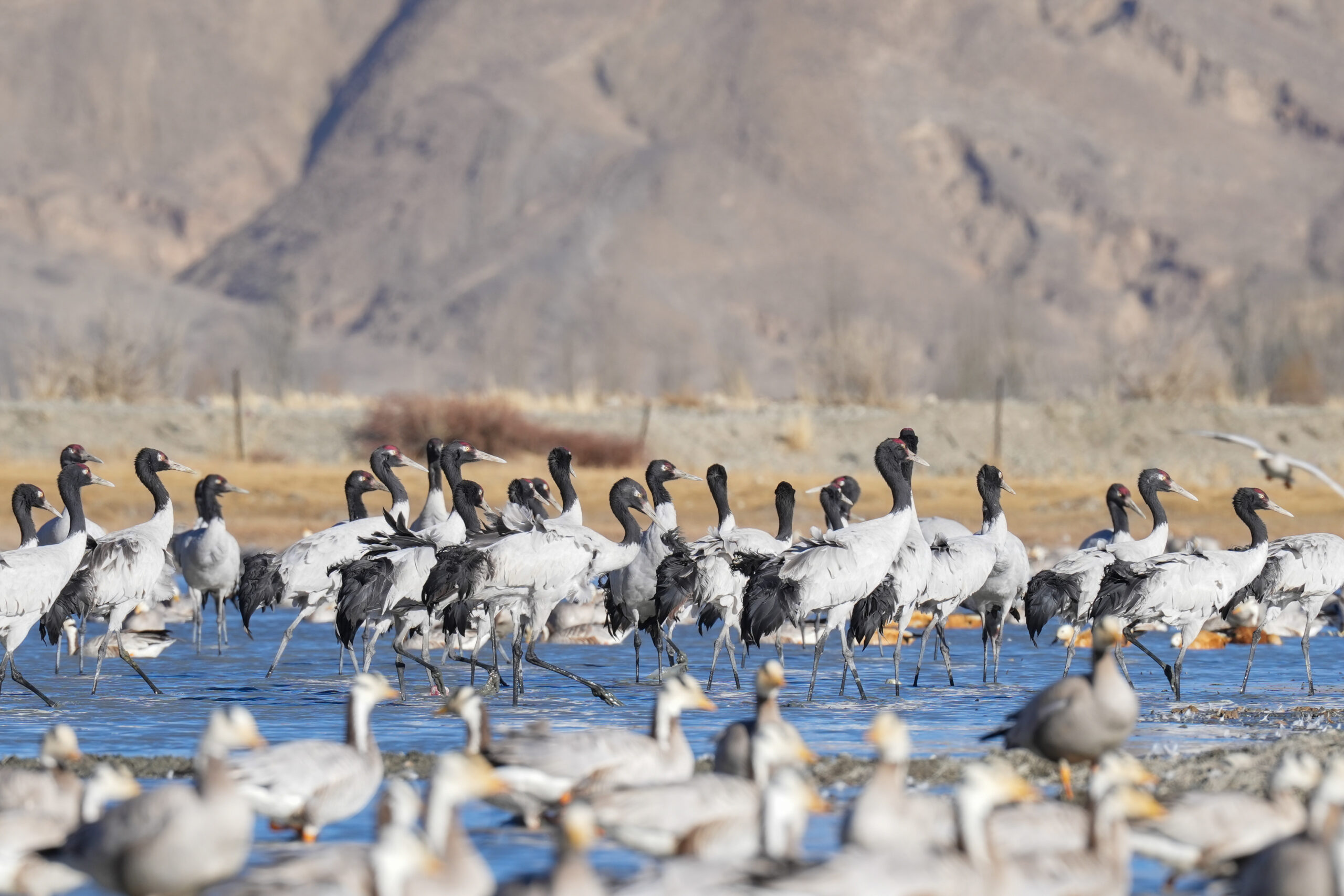 1月10日,西藏雅鲁藏布江中游河谷黑颈鹤国家级自然保护区日喀则片区拉孜县曲玛乡境内,大量越冬的黑颈鹤...