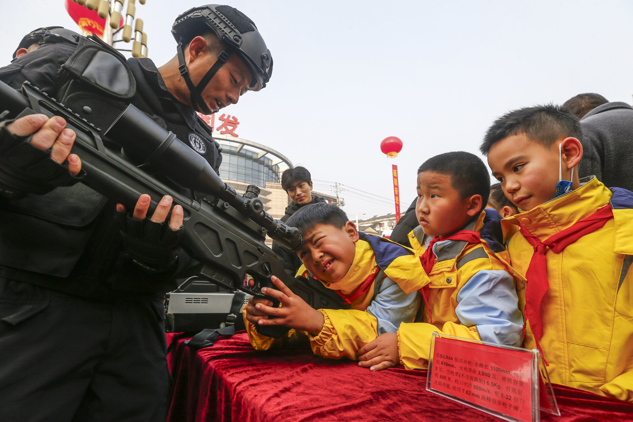 1月10日,在安徽省黄山市屯溪区,特警向小朋友介绍警用装备。当日是第四个中国人民警察节,在安徽省黄山...