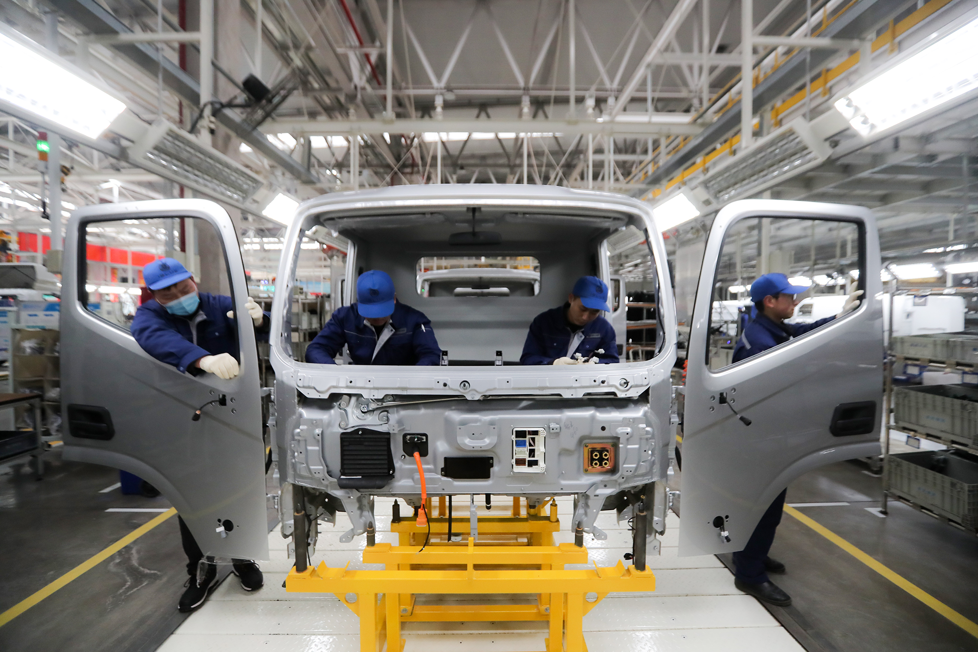 1月8日,在河南省商丘市豫商经济技术开发区现代装备制造产业基地,首批商丘产新能源轻卡车在河南福田智蓝...