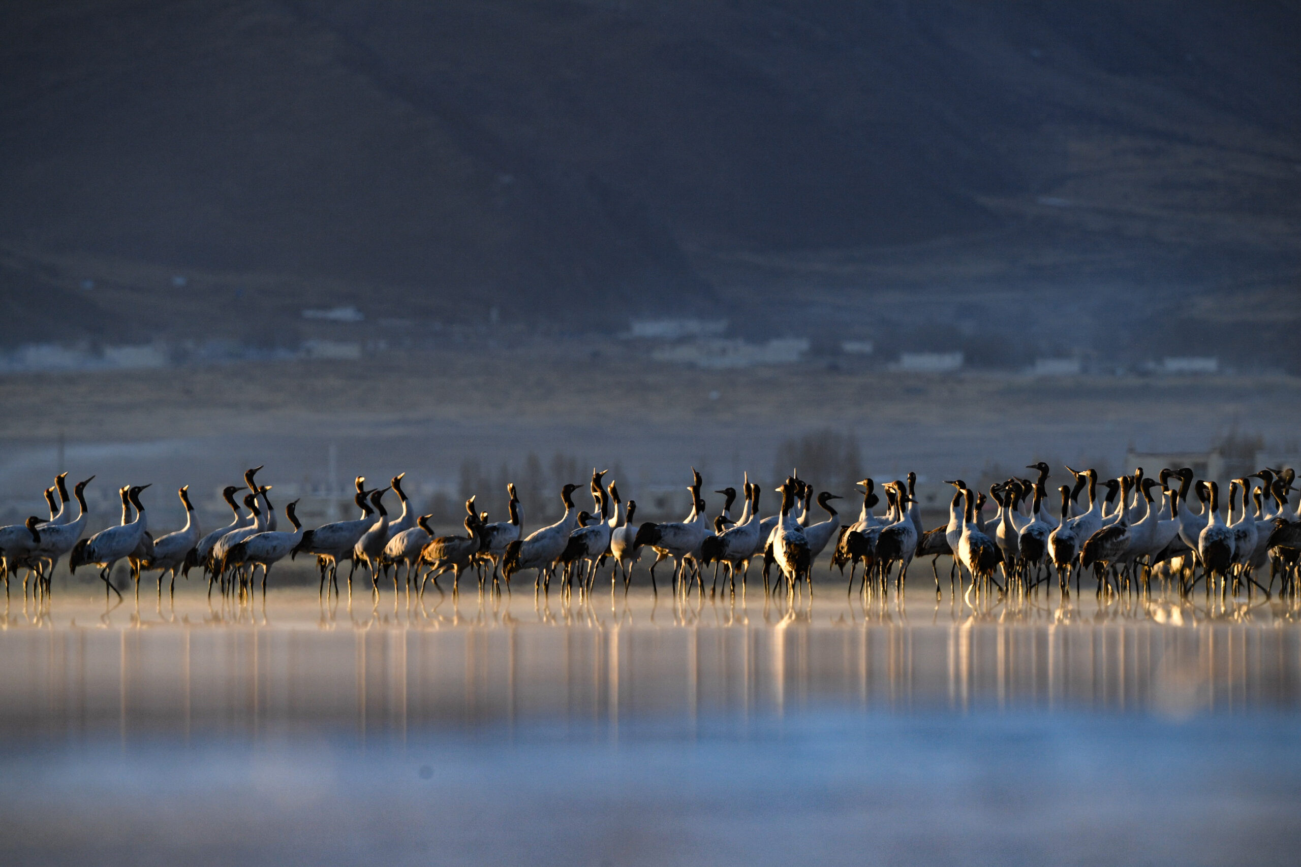 12月28日晨,西藏拉萨林周县黑颈鹤保护区内,黑颈鹤觅食、嬉戏。拉萨北部的林周县平均海拔约4200米...