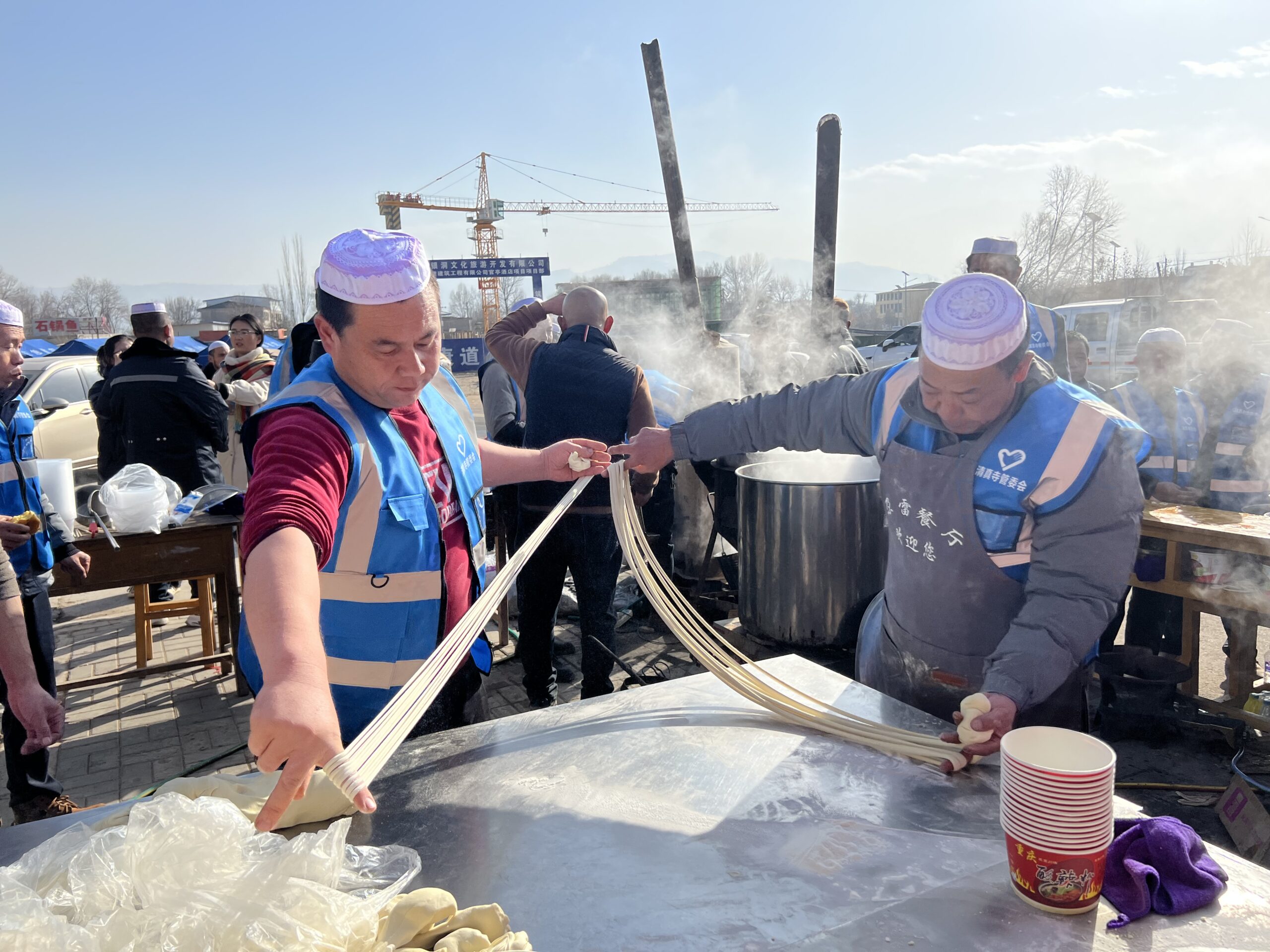 12月21日, 积石山6.2级地震后的第三天,青海省民和县官亭镇志愿者在街头为民众拉拉面,抗震救灾工...