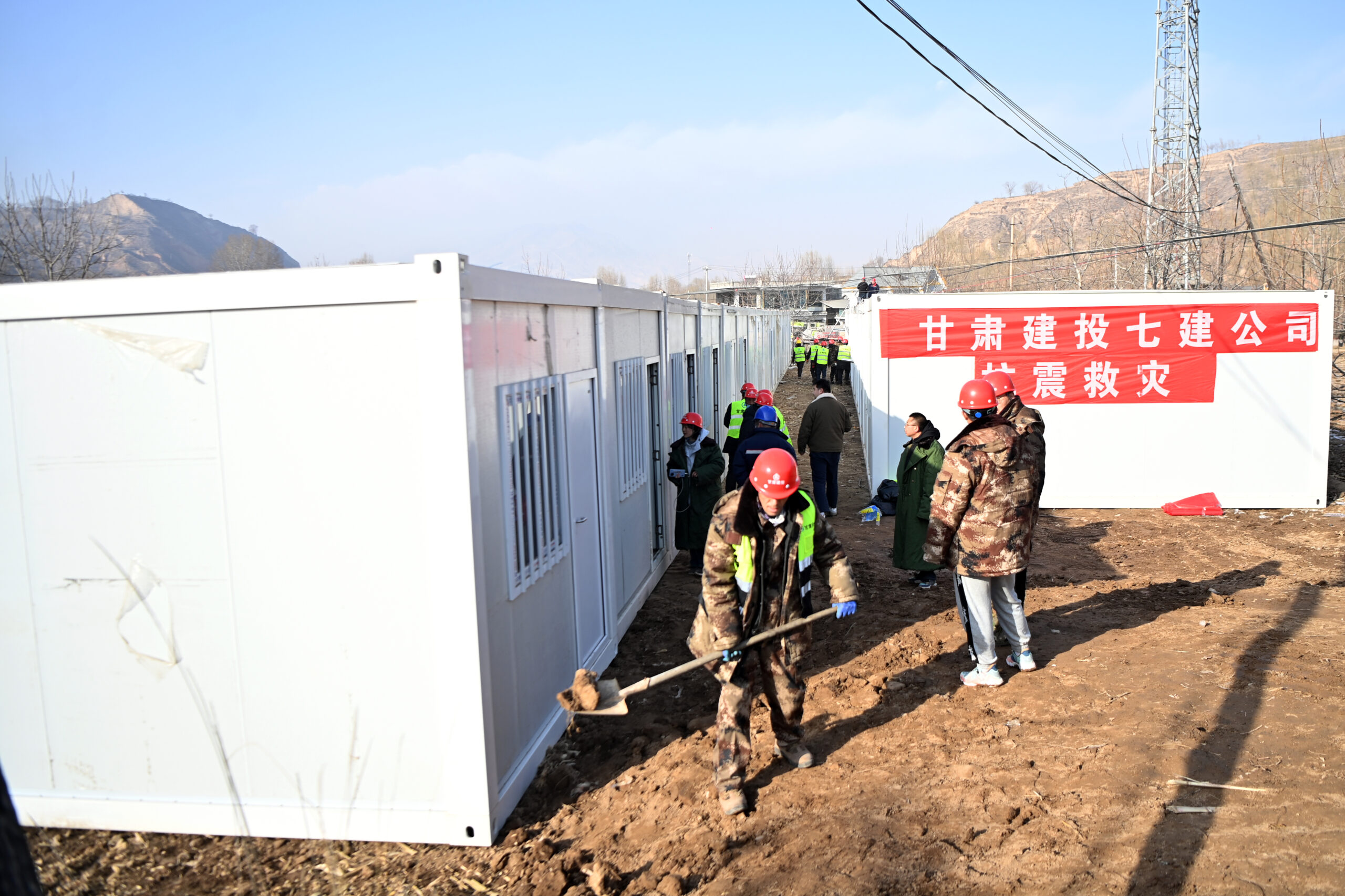 12月21日,工作人员在甘肃临夏州积石山县刘集乡陶家村活动板房建设现场施工。随着积石山县抗震救灾进入...