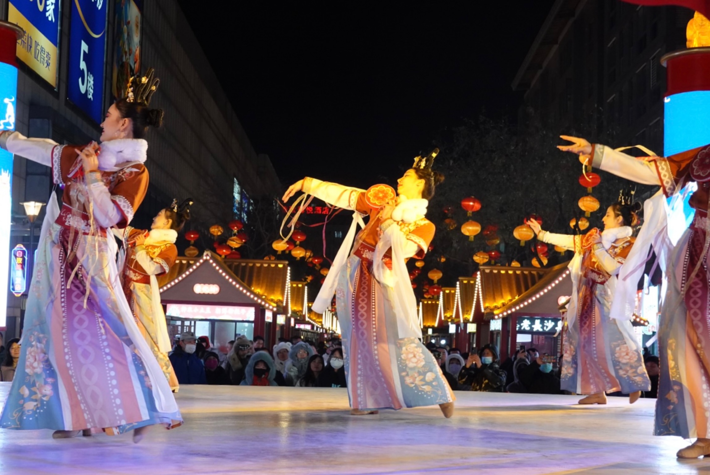 12月21日,随着元旦临近,位于西安市的民乐园步行街在夜晚上演了仿唐舞表演,吸引游客观赏。 未经允许...