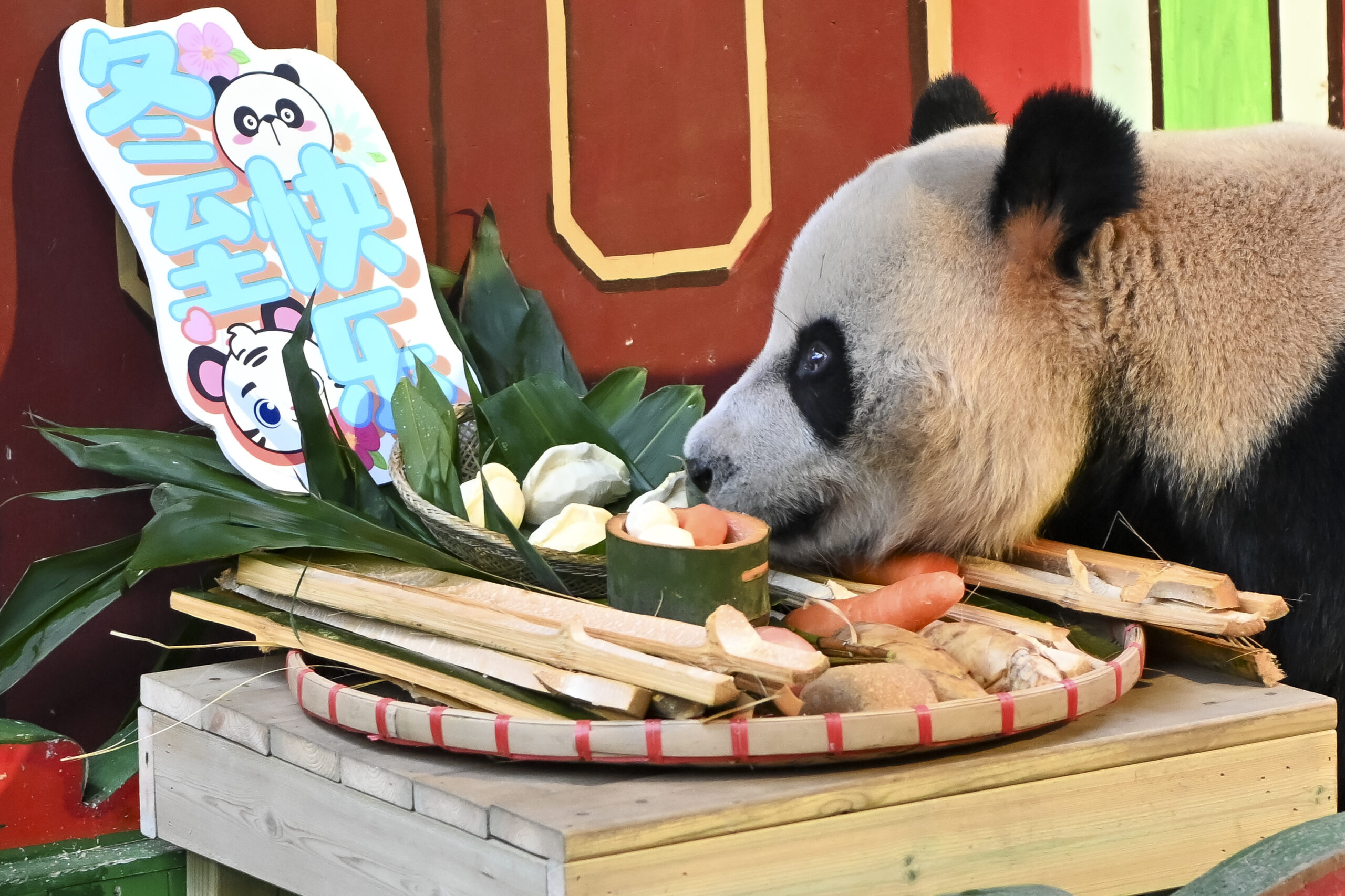 12月21日,中国传统二十四节气中的冬至前夕,广州长隆保育团队用竹笋、胡萝卜、苹果、香蕉等材料为大熊...