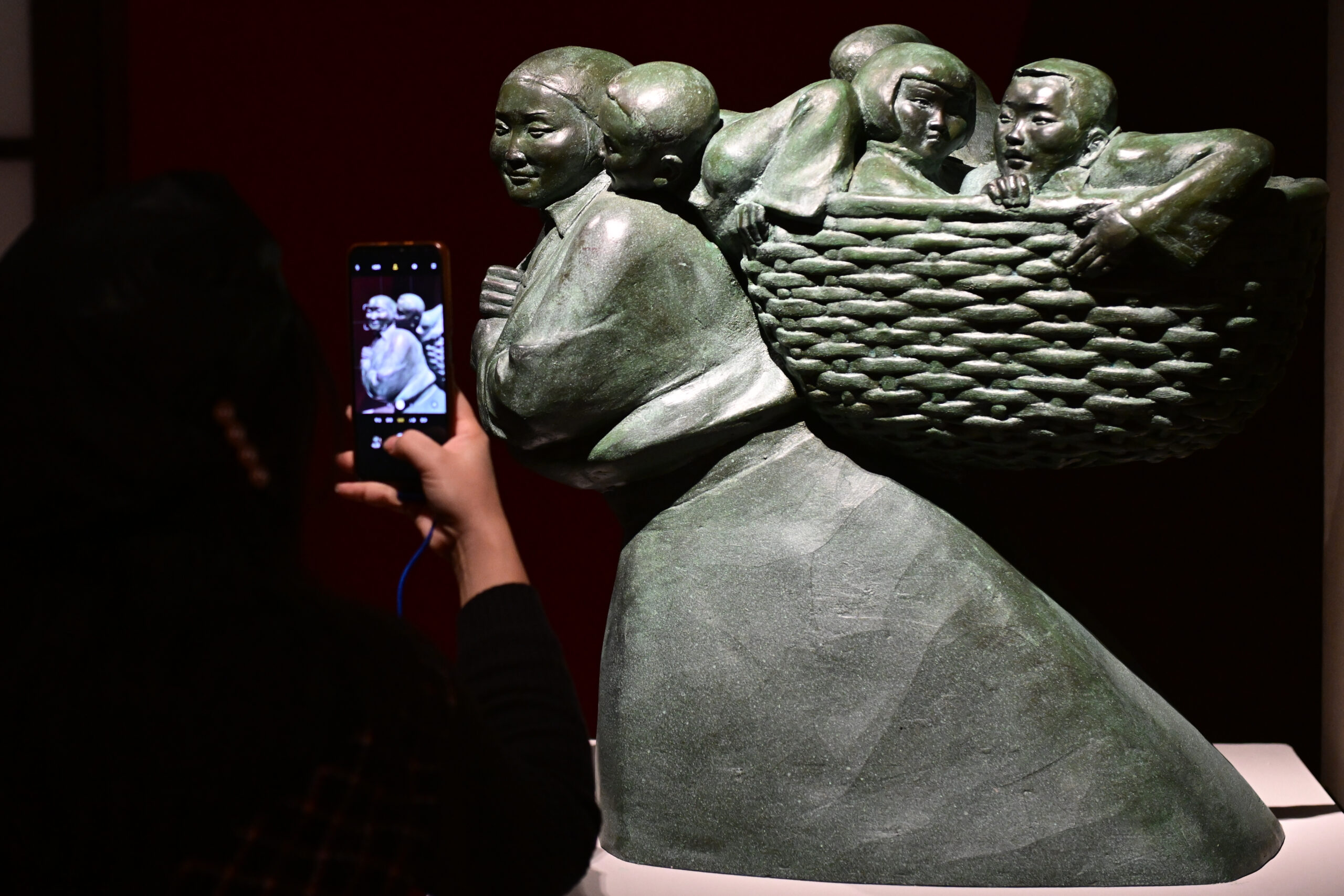 12月17日,参观者在拍摄雕塑《国家的孩子》。据悉,该雕塑的灵感来自三千孤儿入内蒙古的故事。从196...