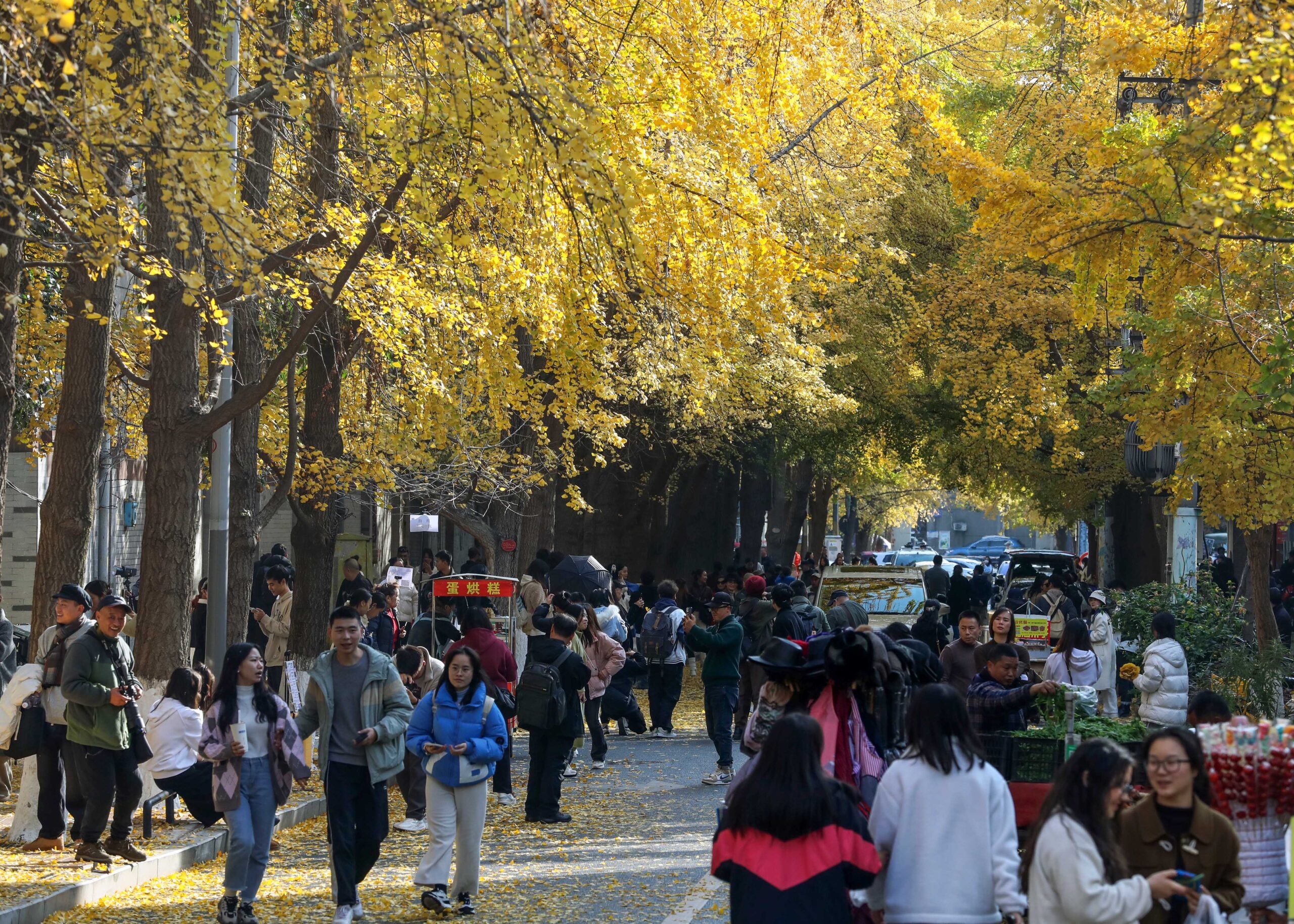 12月14日,民众在银杏树下休闲散步。近日,成都市金牛区一街道两侧银杏泛黄“披金”进入最佳观赏期。 ...
