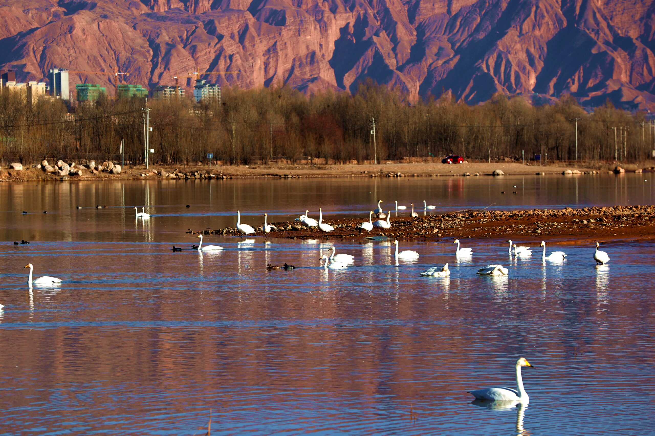 12月8日,在青海省黄南藏族自治州尖扎县,野生天鹅群在黄河周边栖息越冬,它们或畅游河面,或振翅高吟,...