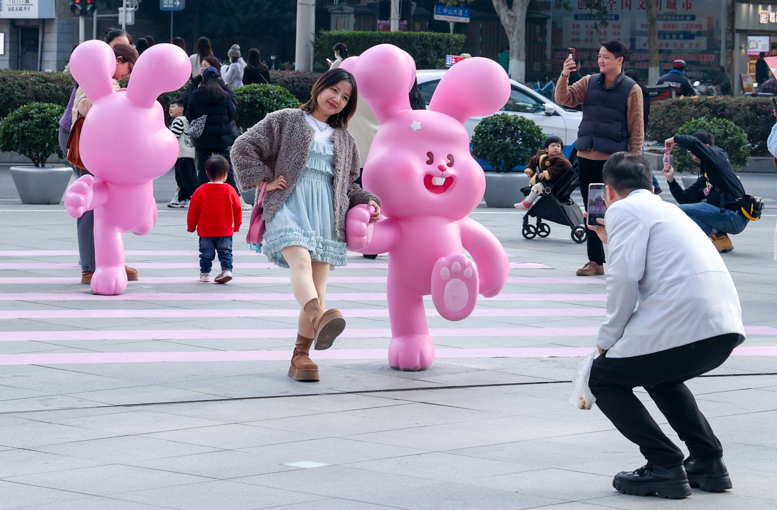 12月5日,湖北武汉,在汉口街头呈现的《遇见你真好》艺术展上,各种造型的粉色乔乔兔吸引众多市民驻足拍...
