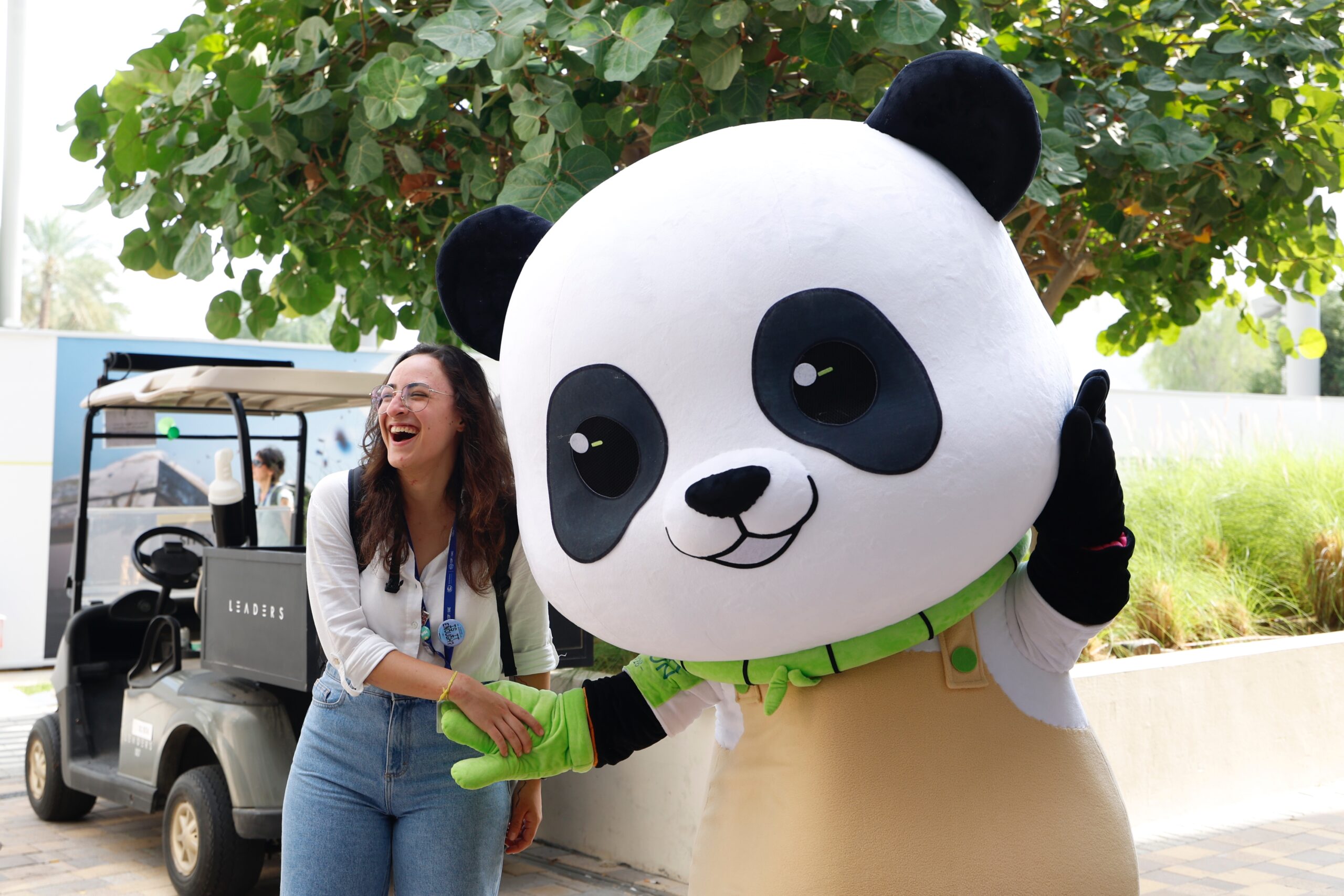 当地时间12月2日,迪拜世博城,联合国气候变化迪拜大会(COP28)“中国角”的大熊猫吸引与会者合影...