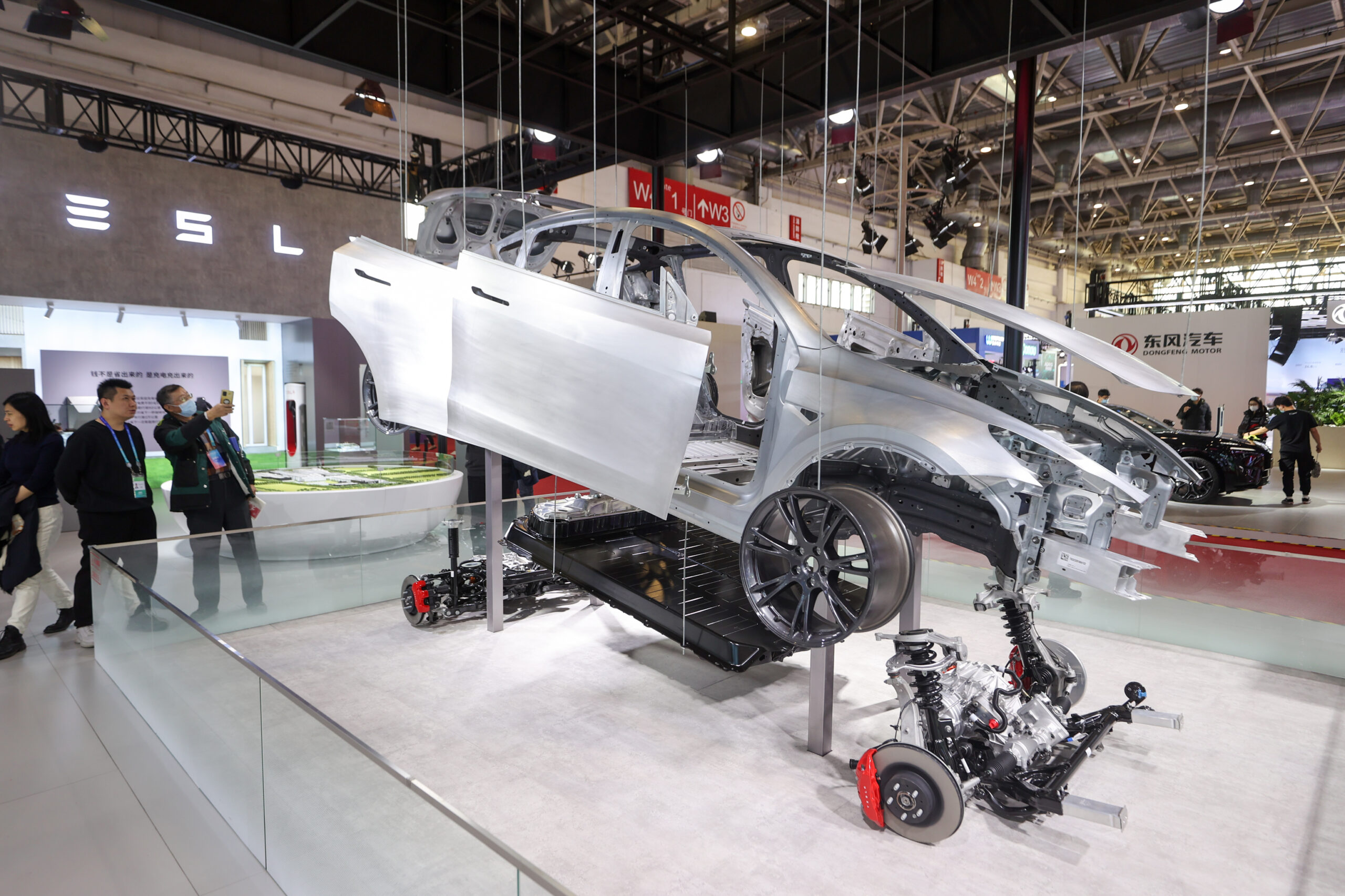 12月1日,在北京举行的中国国际供应链促进博览会上,新能源车供应链受到关注。图为特斯拉展台的mode...