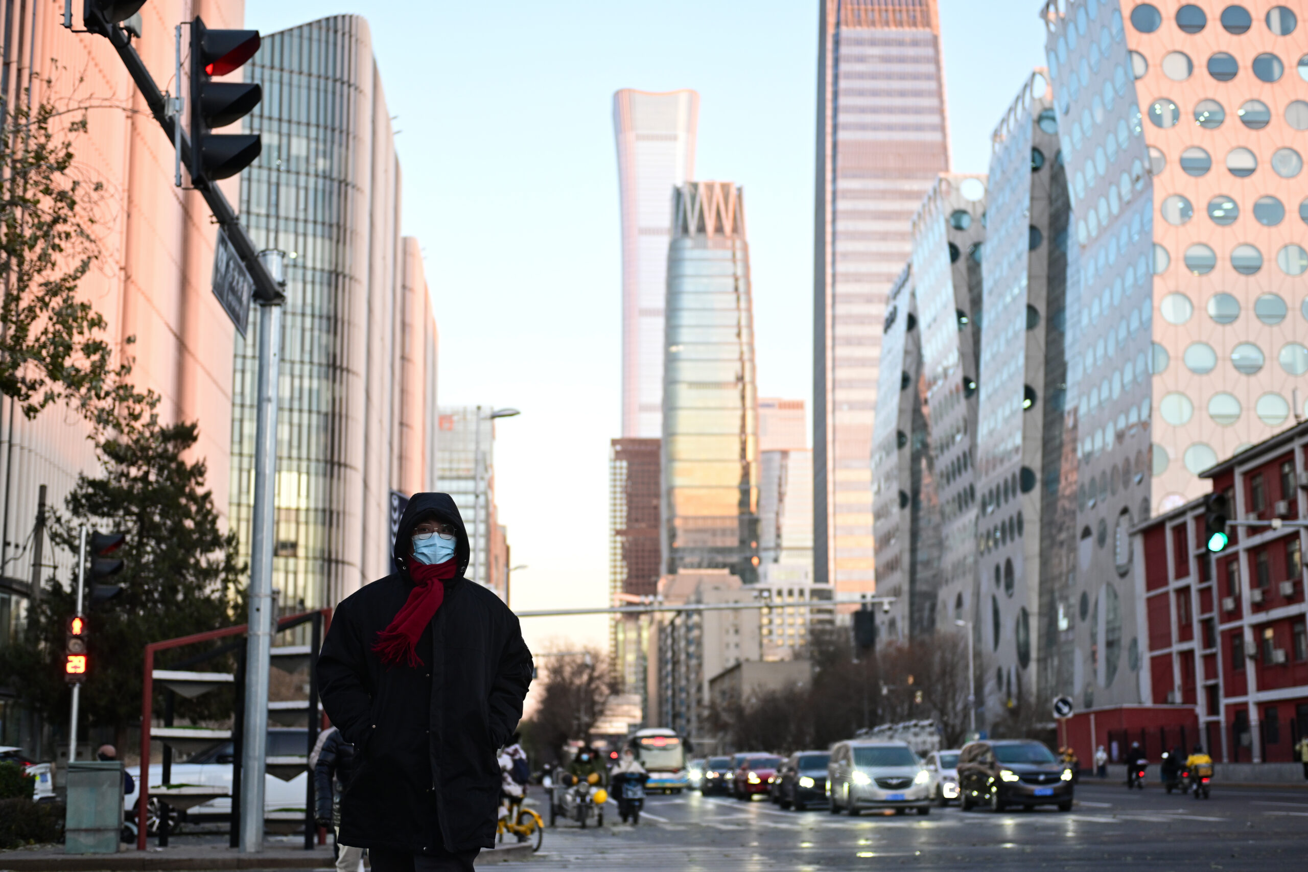 11月29日,北京市民在寒风中出行。当日19时55分,北京市气象台发布大风蓝色预警信号,北风强劲,风...
