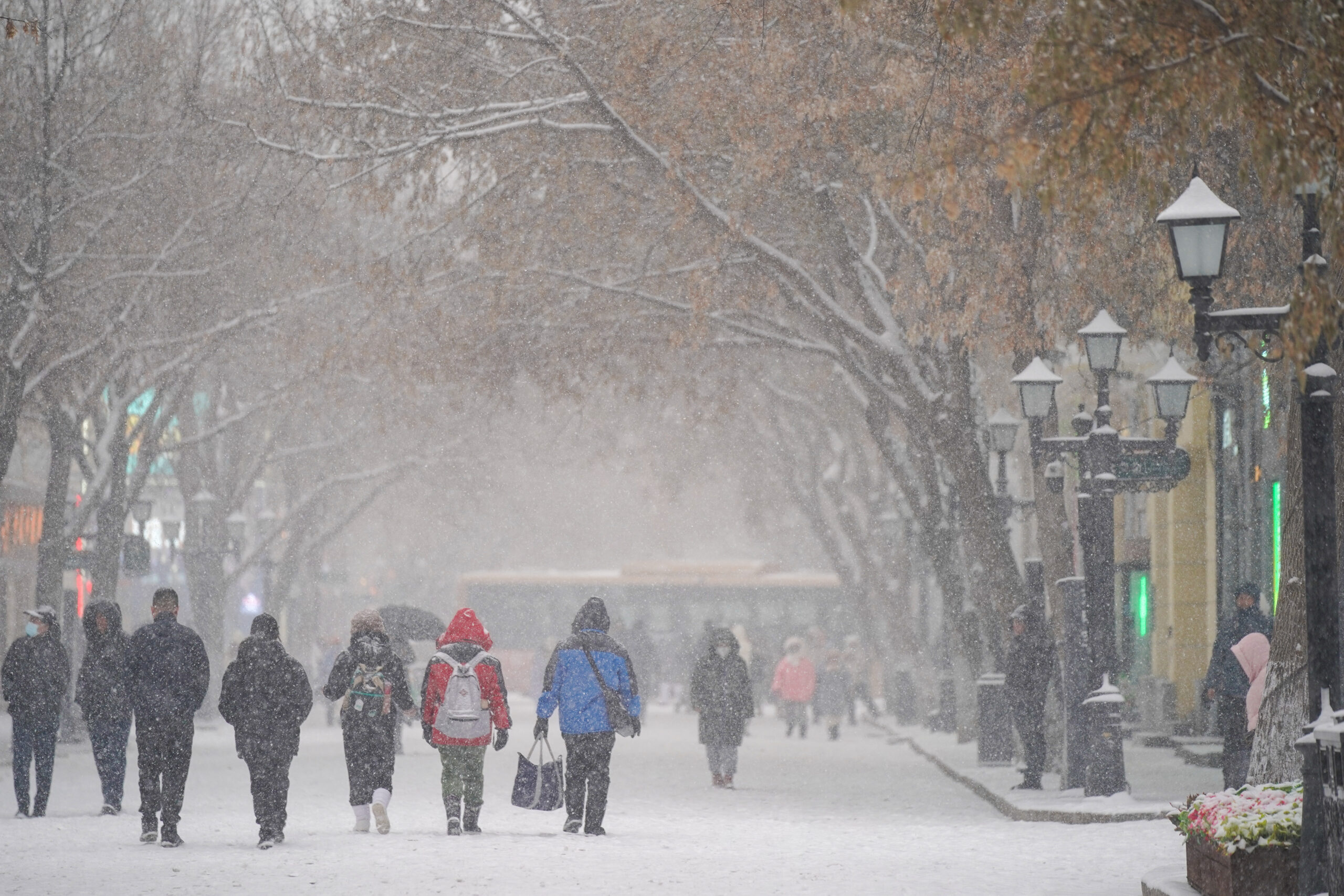 11月22日,黑龙江哈尔滨,市民雪中出行。当日,小雪节气,黑龙江哈尔滨迎来降雪天气,市民、游客冒雪出...
