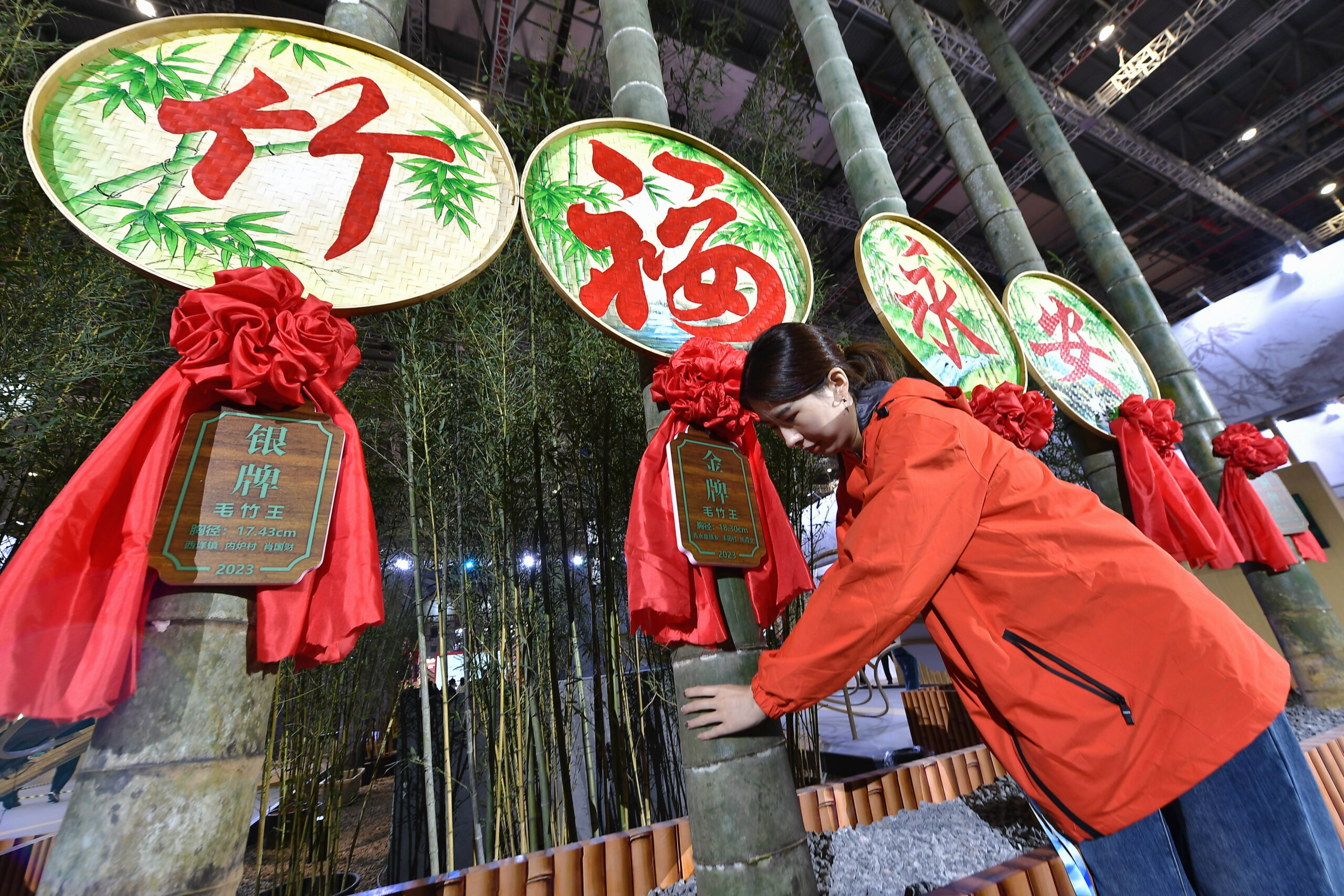 11月16日,展馆内的“毛竹王” 吸引参观者。当日,2023国际(永安)竹博会在国家会展中心(上海)...