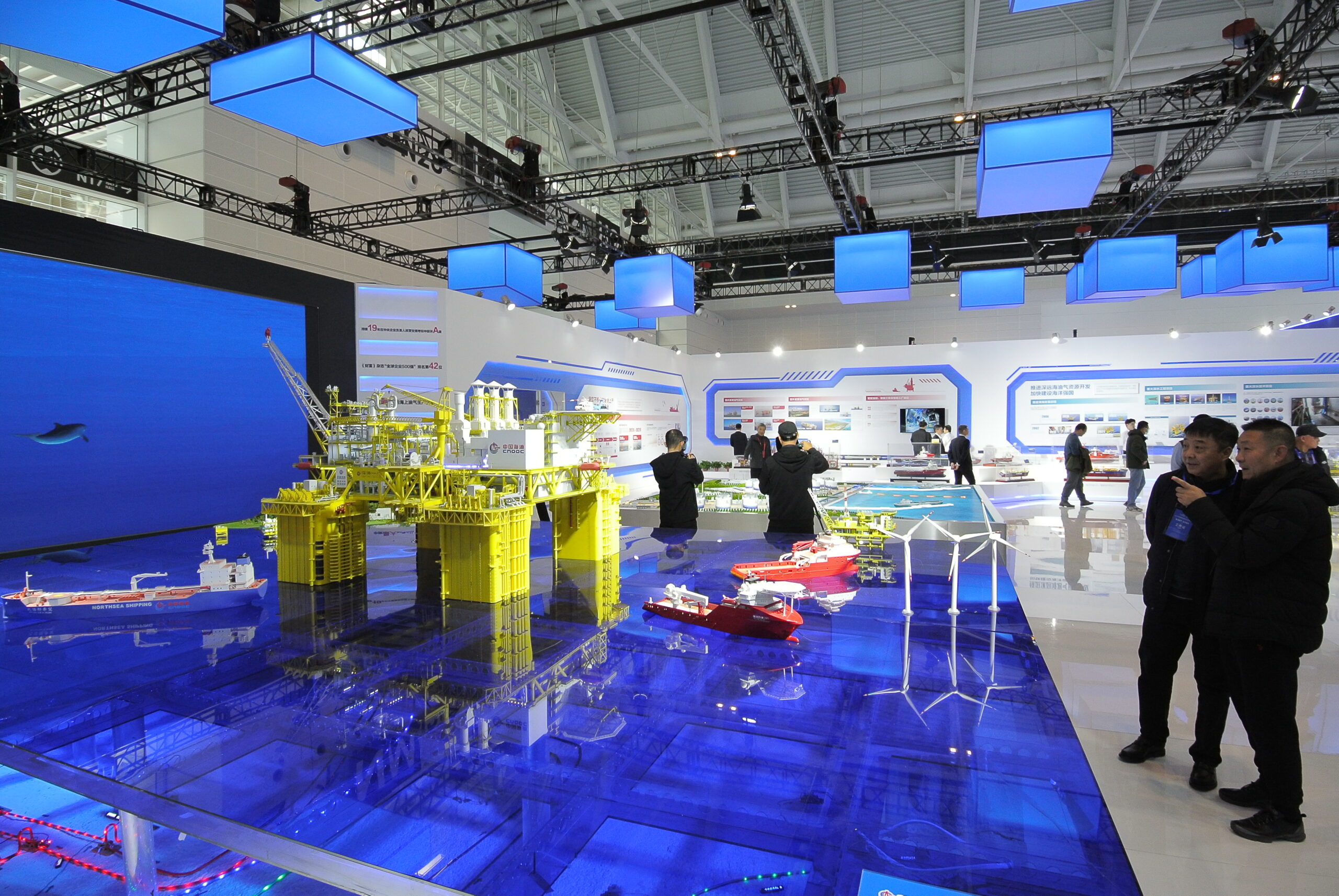 11月16日,与会嘉宾在中国海油展位参观“深海一号”能源站模型。当日,2023天津国际航运产业博览会...