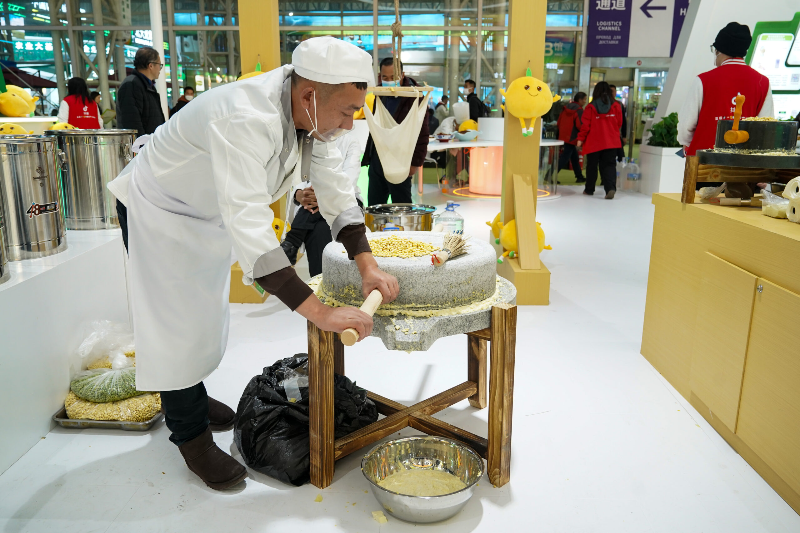 11月15日,黑龙江展区的参展商用石磨磨黄豆。首届中国(黑龙江)国际绿色食品和全国大豆产业博览会于1...