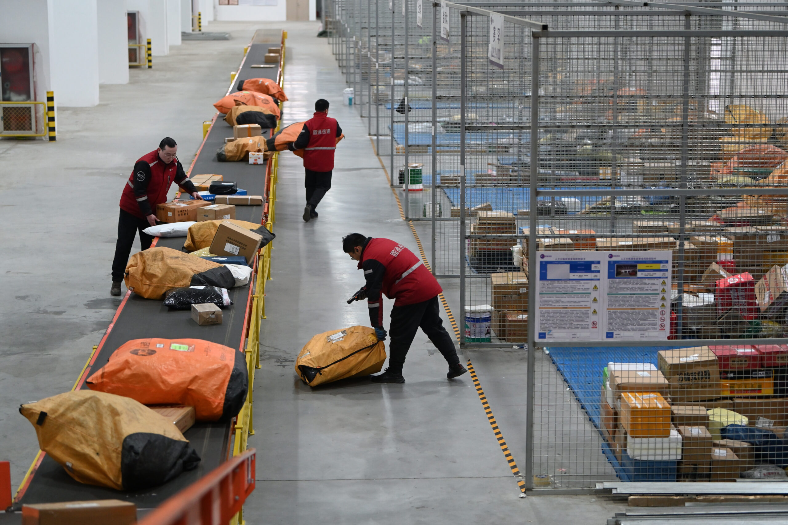 11月13日,内蒙古呼和浩特市快递分拨中心快件量迎来高峰期。图为呼和浩特市圆通速递分拨中心,工作人员...