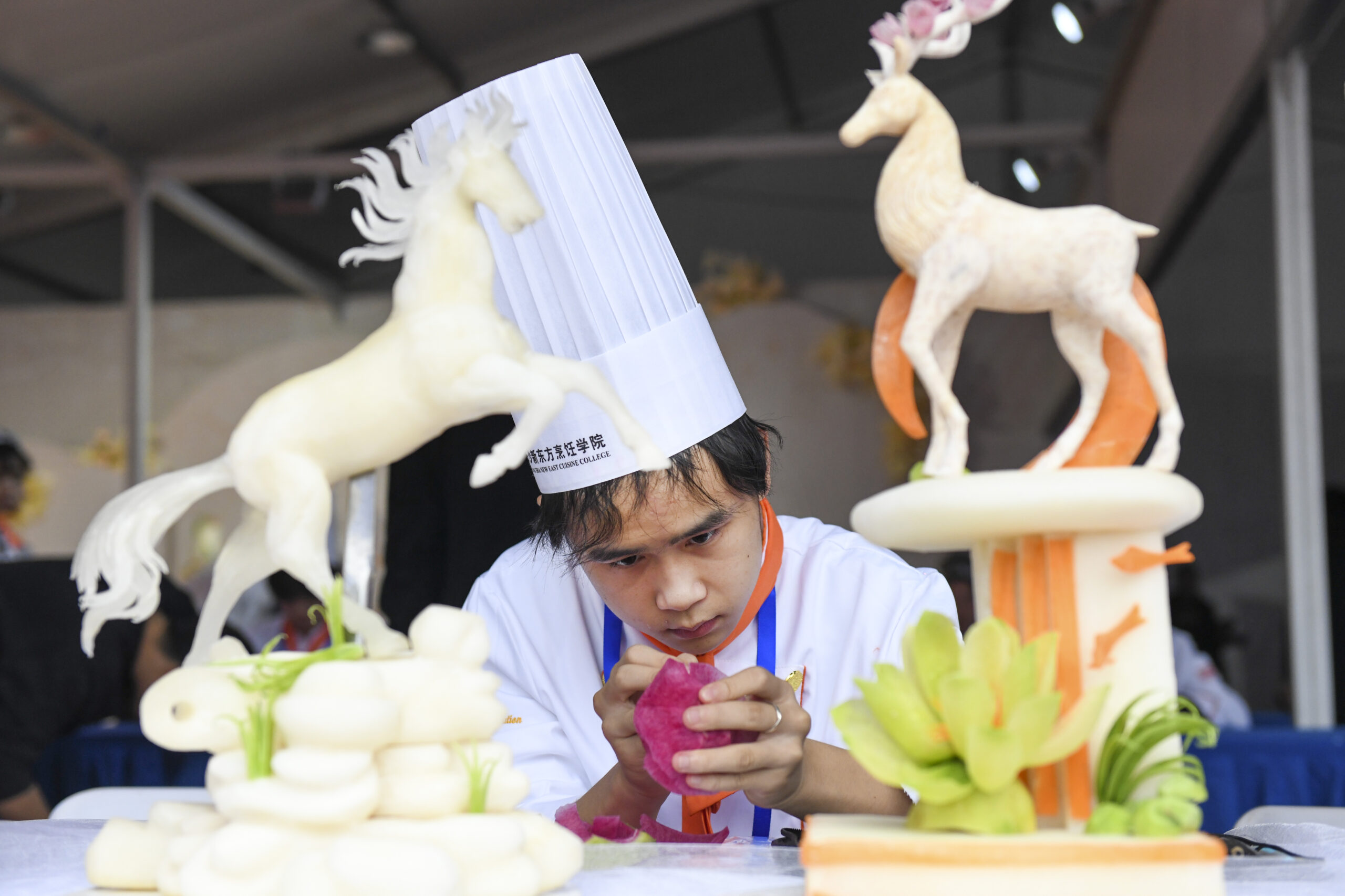 11月8日,选手参加烹饪雕花项目的比赛。当日,长沙市第二届职业技能大赛在长沙贺龙体育中心开赛。9支代...