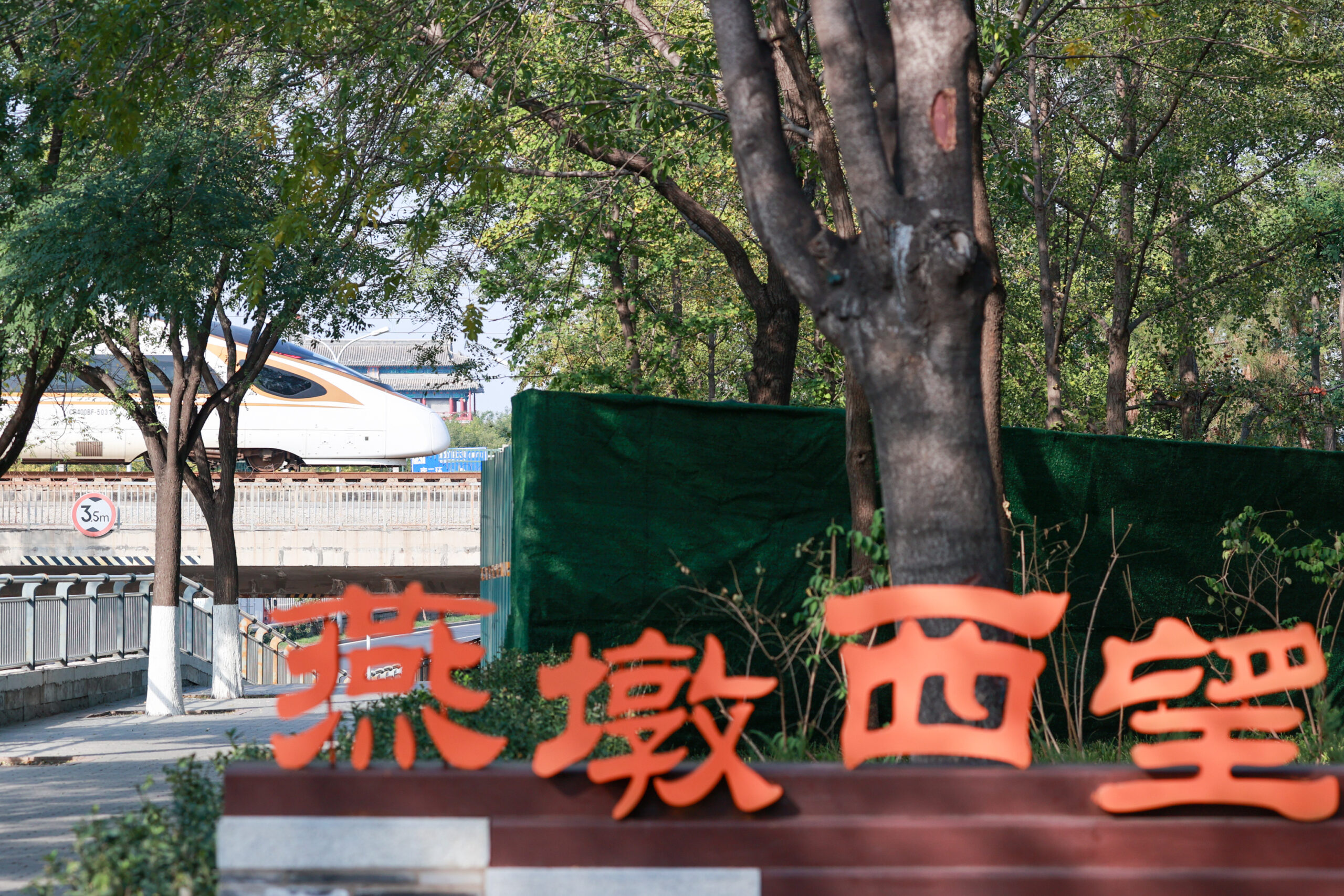 11月8日,一列复兴号列车从北京燕墩西望公园旁驶过。燕墩西望公园是一块面积约2900平方米的开放式绿...