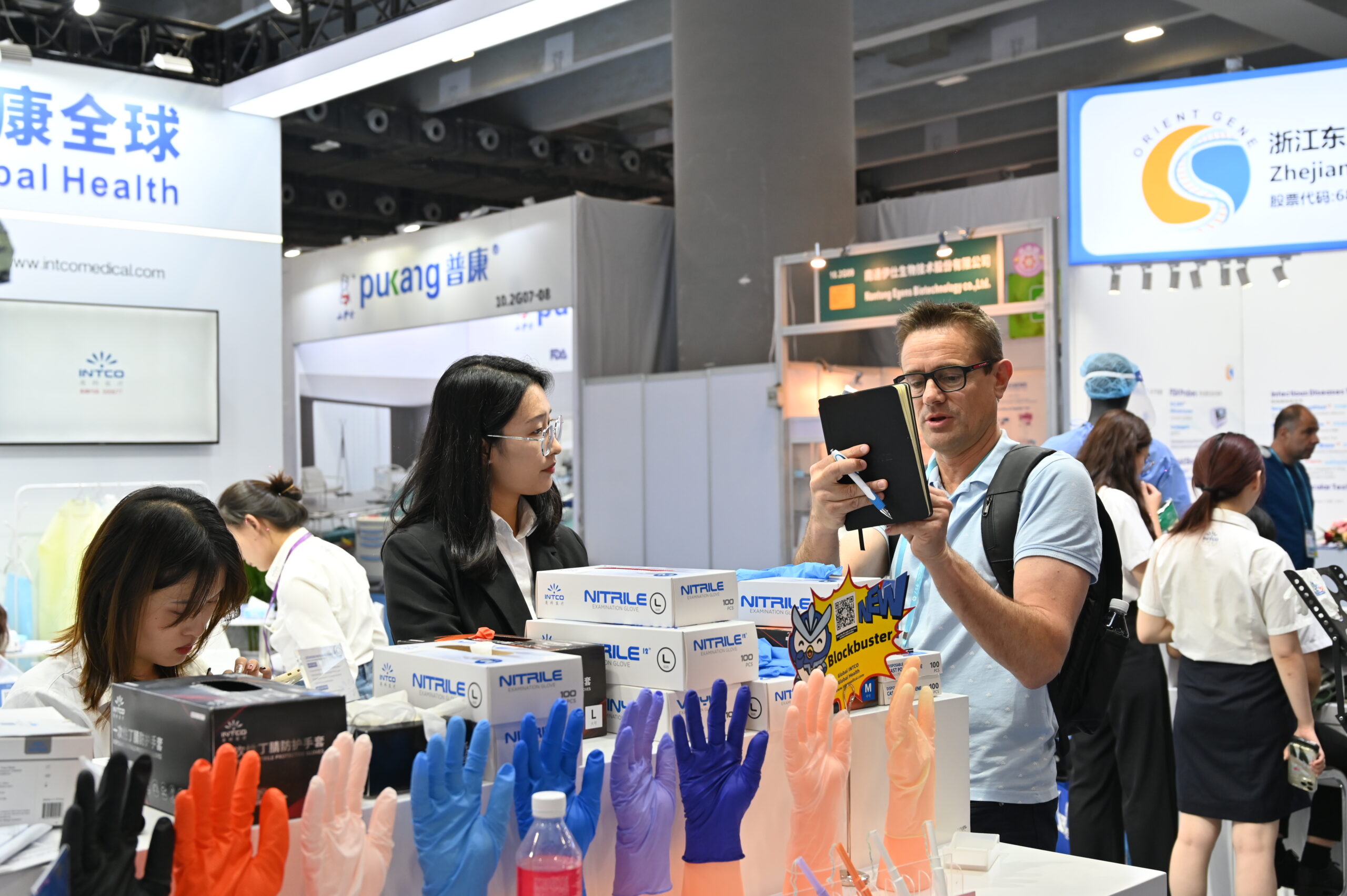 11月2日,广东省广州市,境外采购商(右)向参展商咨询医疗产品。近日,第134届中国进出口商品交易会...