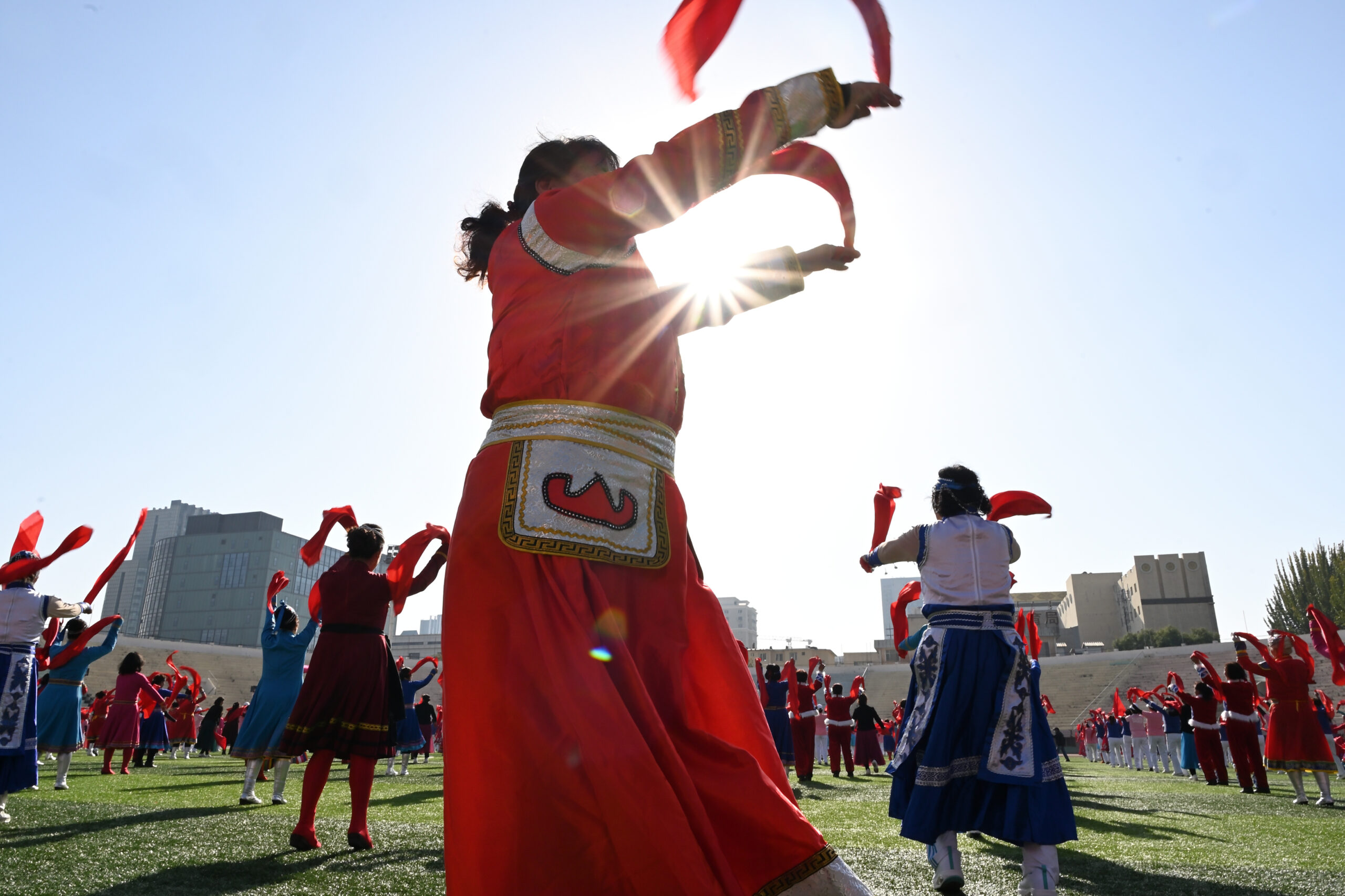 10月25日,内蒙古呼和浩特,民众盛装跳安代舞。当日,呼和浩特市“五个一万”全民健身工程系列活动之万...