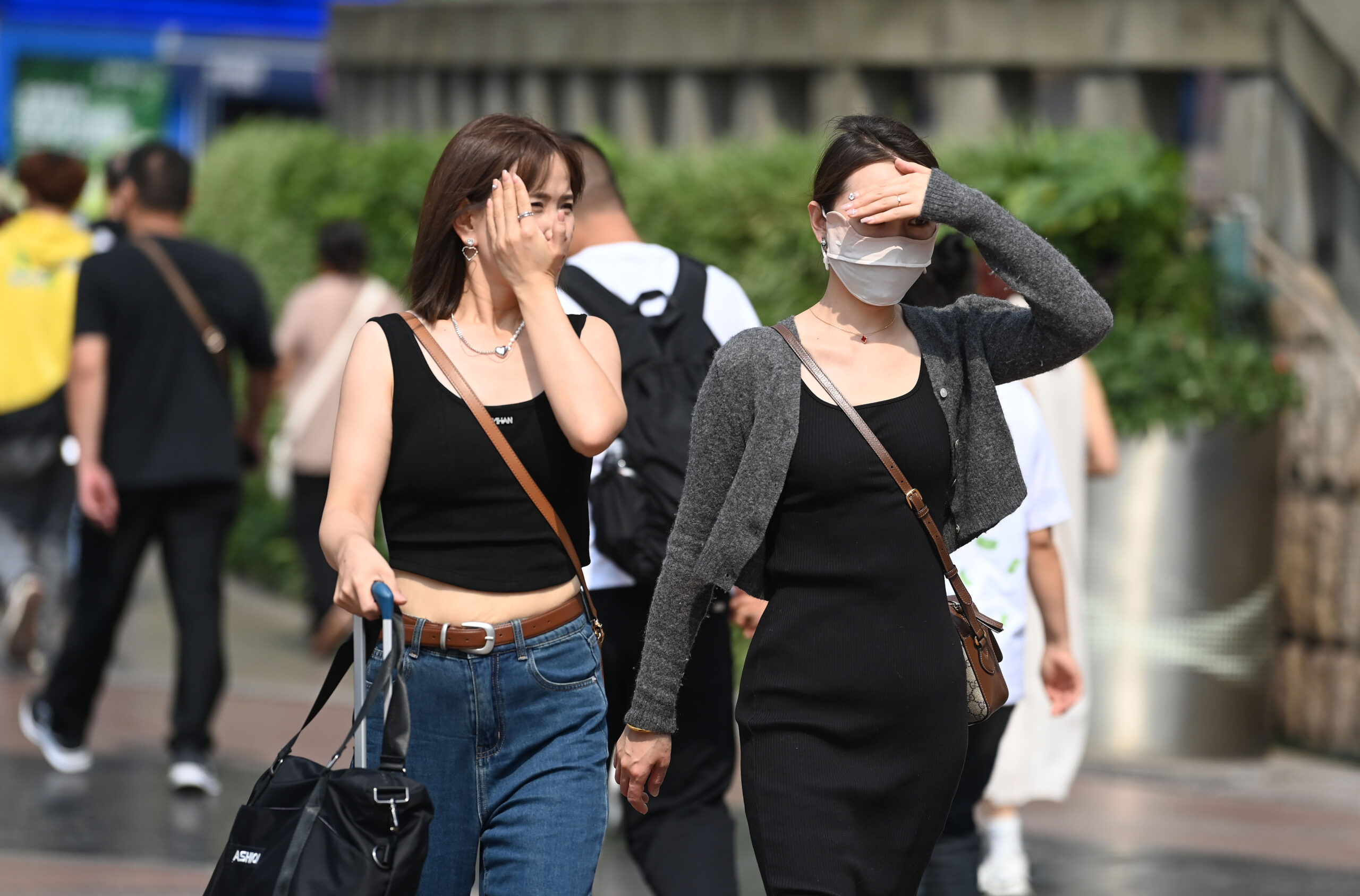 10月17日,重庆迎来秋日暖阳,主城区最高气温逼近30℃。图为街头市民用手遮挡阳光。 未经允许不得转...