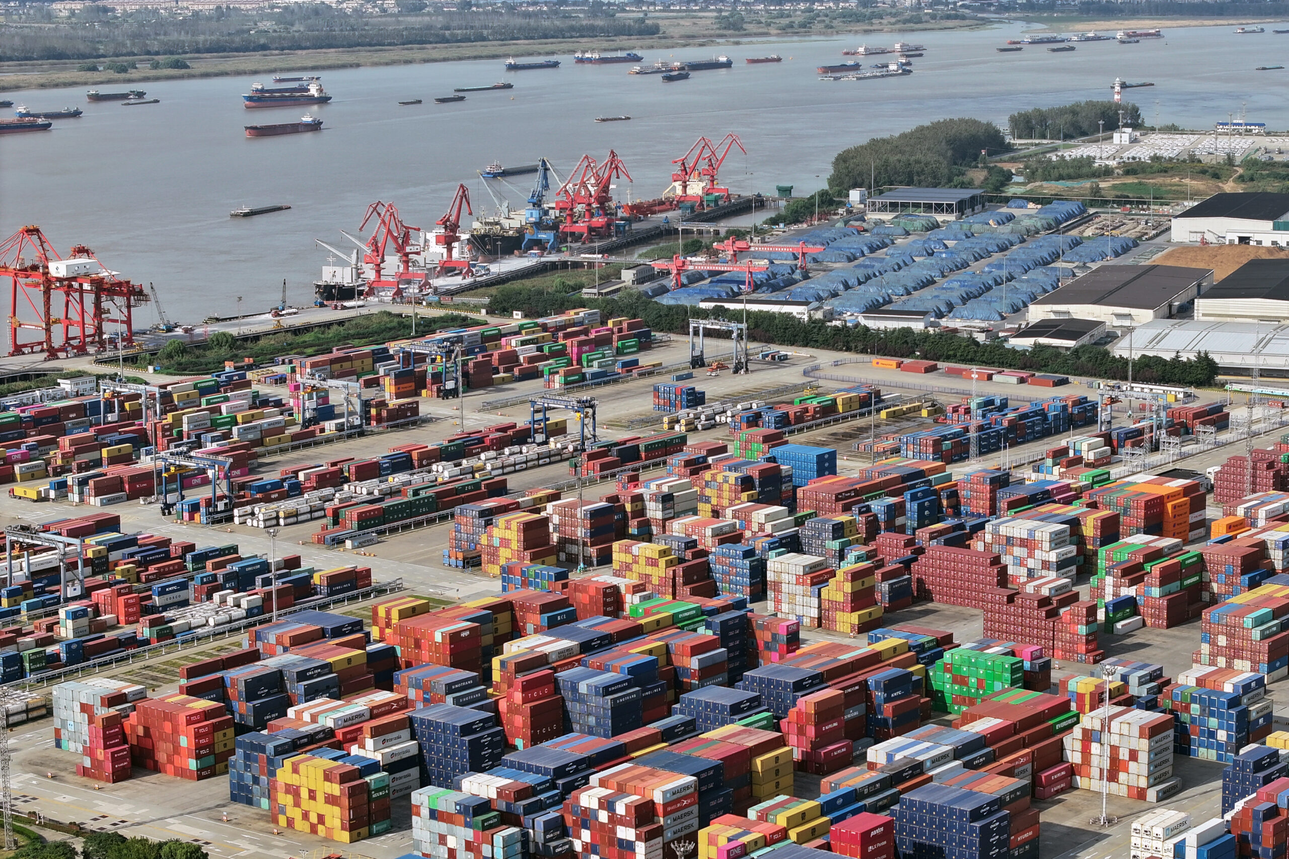 10月13日,航拍江苏南京龙潭港进出口集装箱码头。中国海关总署13日公布的最新数据显示,9月中国进出...